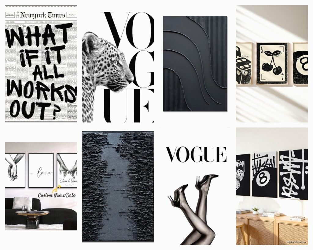 Etsy has a ton of black art prints and you can find stuff that isn’t mass-produced. Search for “black abstract printable art” if you wanna save money and print it yourself at a local print shop. Quality varies wildly though so check the resolution specs.