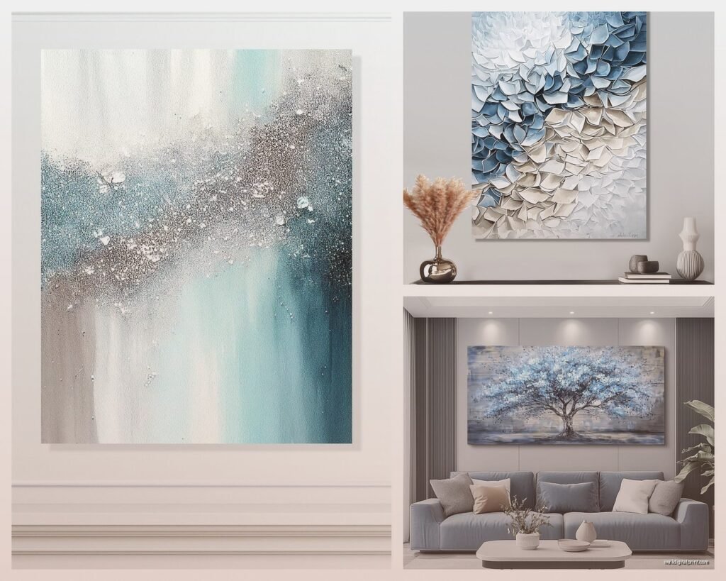Okay so there’s basically four categories of blue and silver wall art and they all hit differently depending on your space: