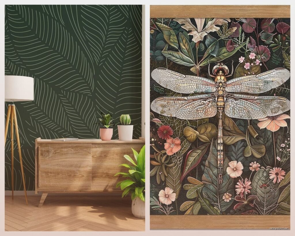 Abstract botanical: Not like cutesy watercolor leaves but more architectural plant studies. Think oversized fern prints, dramatic palm fronds, those vintage botanical illustration styles but in darker tones. I found this set on Etsy – wait I forgot to mention, Etsy is honestly where like 80% of good dark green art lives – that was tobacco plant illustrations in the darkest green and they looked incredible in a maximalist living room I staged.