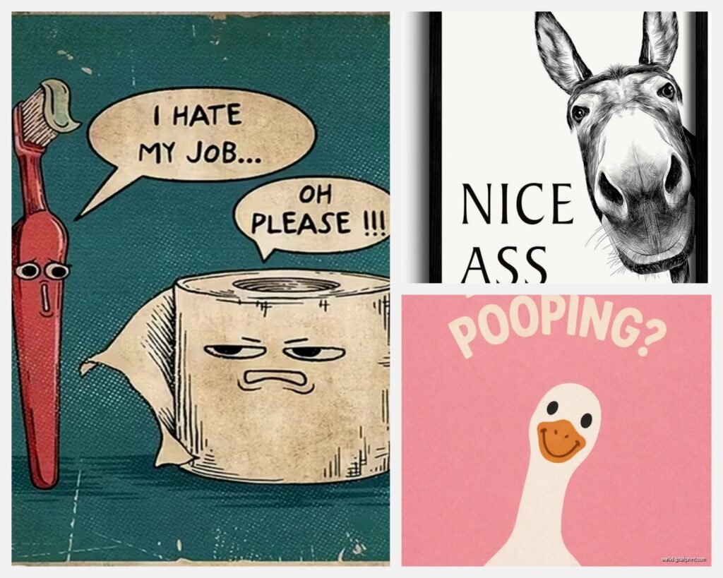 So this kinda depends on your overall bathroom vibe but humor signs are surprisingly versatile. In a modern minimalist bathroom, go for simple black and white designs with clean typography. The humor comes from the words not busy graphics.