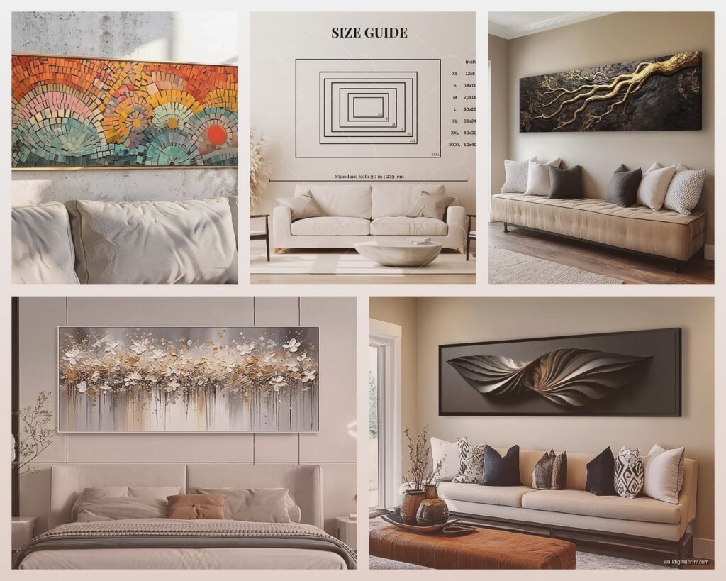 Okay so the thing about horizontal art is it literally changes the entire shape of your room. Like your eye follows horizontal lines and makes spaces feel wider, which is why every designer will tell you to use them above sofas. But here’s what nobody mentions – they only work if you get the scale right, and I see people buying these tiny 24-inch pieces for massive walls and wondering why it looks weird.