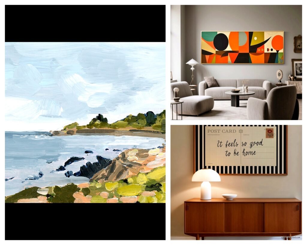 Living rooms are obviously the sweet spot for horizontal art. Above the sofa is classic for a reason it anchors your seating area and creates a focal point. Just make sure your piece is wide enough I see so many living rooms with tiny horizontal pieces that look like they’re drowning above a big sectional.