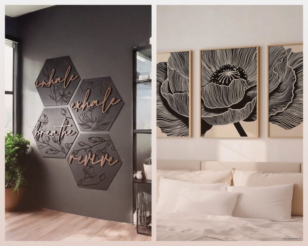 Overly busy patterns that compete with your bedding or wallpaper. Too much text or word art unless it’s super minimal. Anything too literal or obvious like a picture of a bed in your bedroom… just no. Neon colors unless you want to feel like you’re sleeping in a nightclub. Super glossy finishes that create glare. And please, no Live Laugh Love stuff if you’re going for modern.