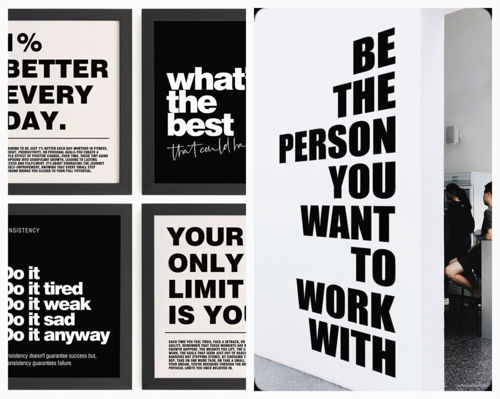 Sans serif fonts – clean, modern, easy to read – work for 90% of office spaces. I like Helvetica, Futura, or Montserrat. They’re straightforward and don’t distract from the actual message.