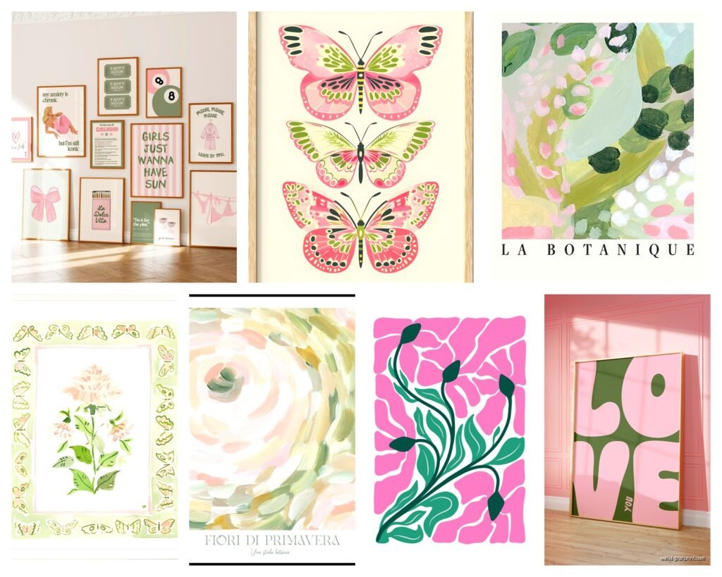 The thing about pink and green wall art is that it can go preppy SO fast, and sometimes that’s exactly what you want, but sometimes you accidentally end up with a Lilly Pulitzer store explosion and that’s not for everyone. I’ve tested like fifteen different shade combinations at this point because my dog knocked over my coffee onto a mood board and I had to start over anyway, so might as well experiment right?