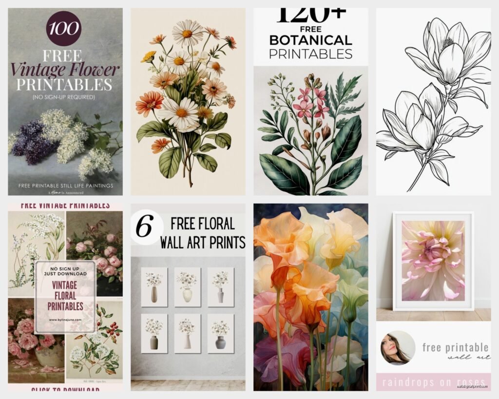 Oh and this is gonna sound weird but Etsy shops sometimes offer free samples. I’ve downloaded several free floral prints from shops that sell bundles – they give you one or two free to show the quality. Just search “free printable floral wall art” on Etsy and filter by price: free.