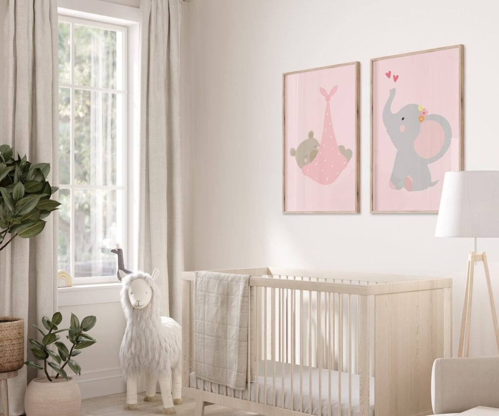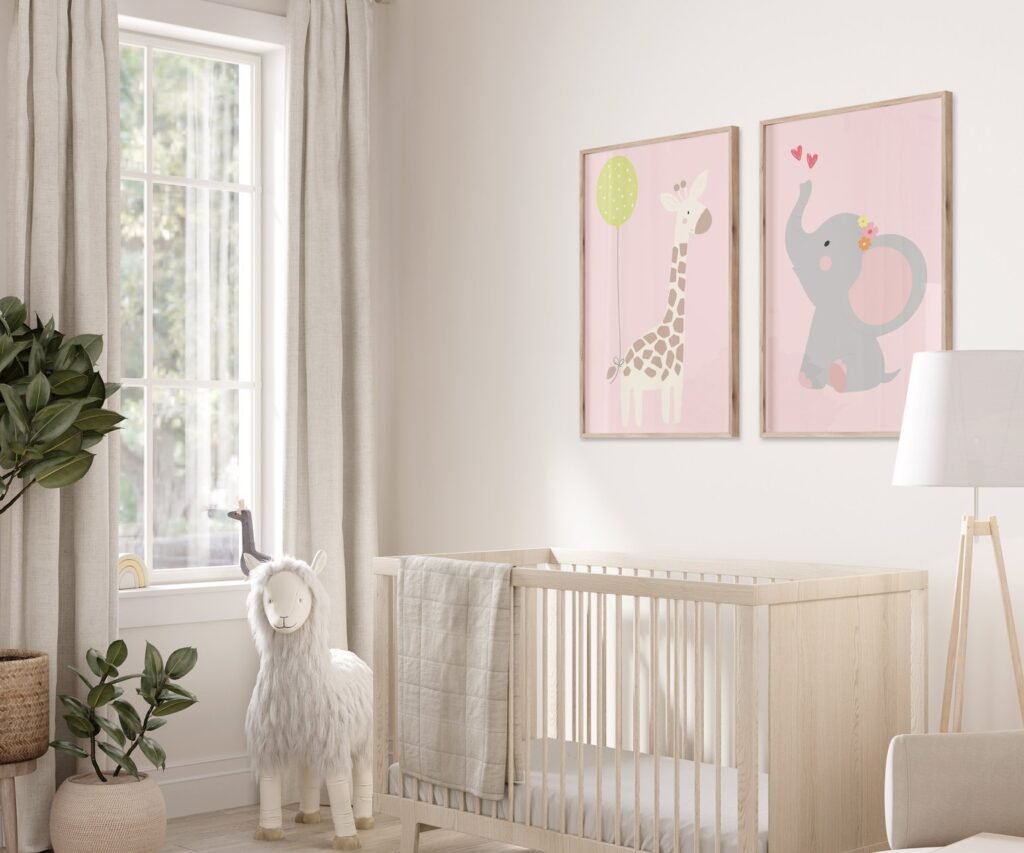 Girl Nursery wall art animals, pink baby room decor, bear, elephant, giraffe, safari animals set of 2