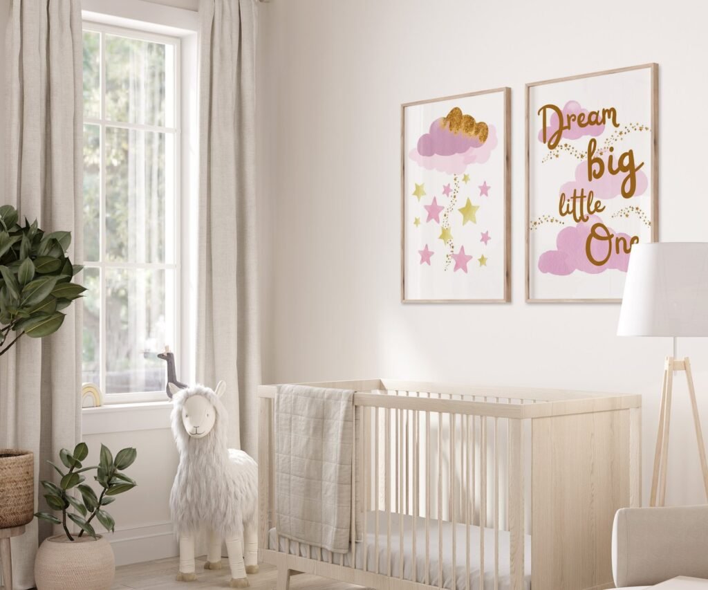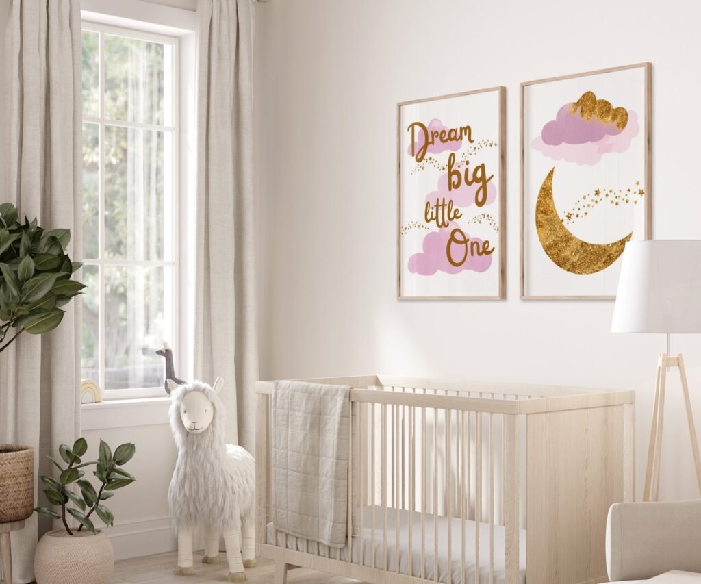 Girl pink and gold, dream big little one, cloud and stars, moon and star set of 2