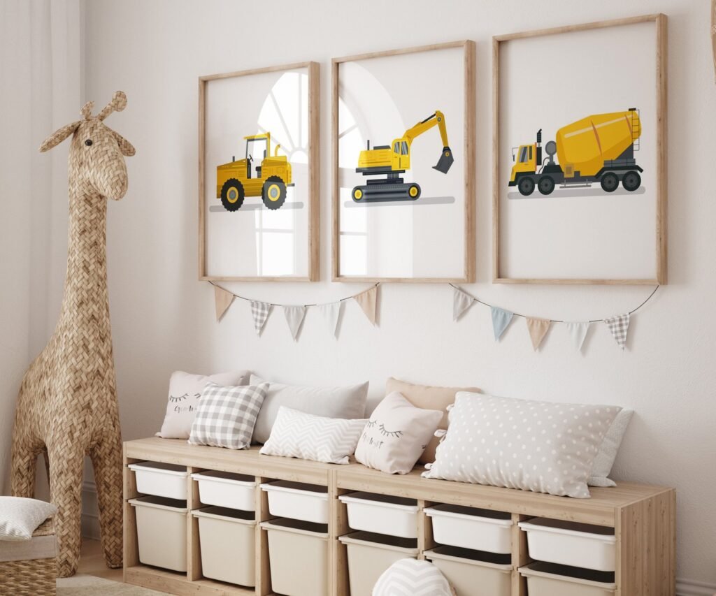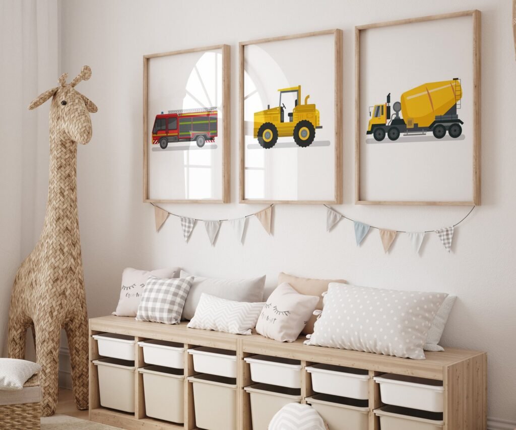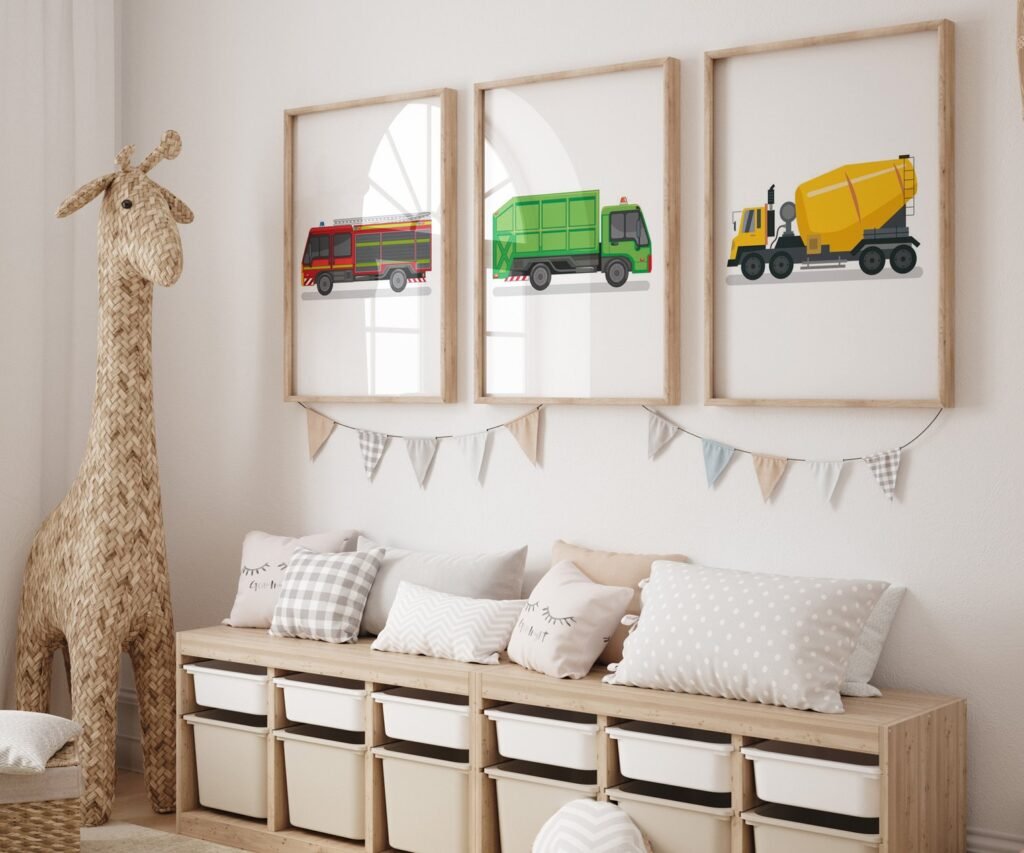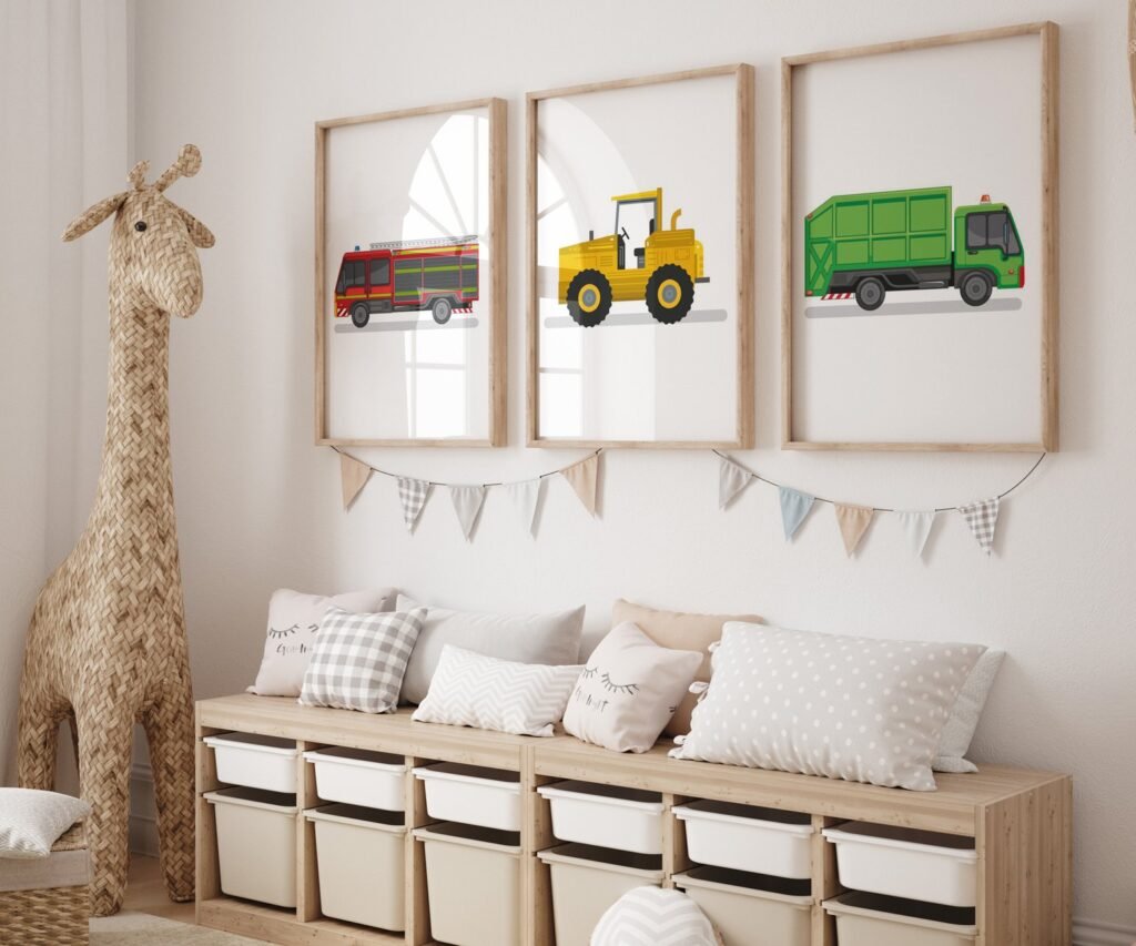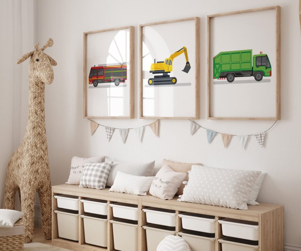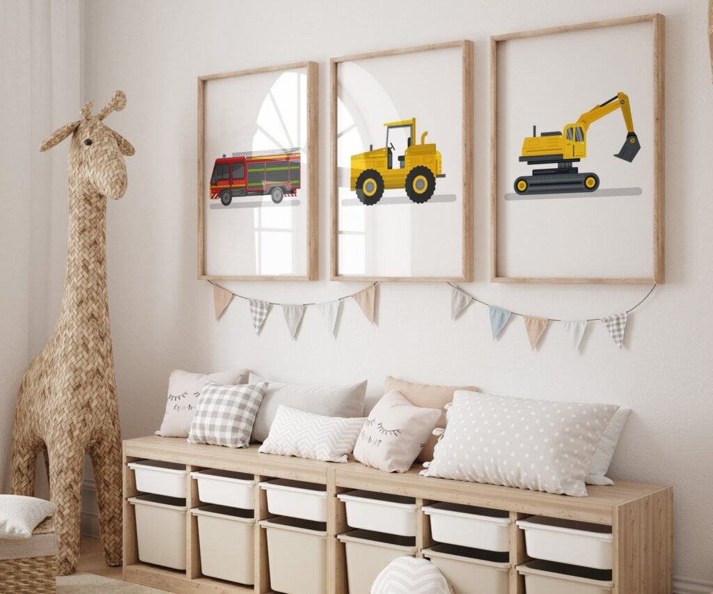 set of 3 Vehicle Prints, Construction Wall Art, Transportation Print Nursery, Kids Gallery Wall Set, Truck Wall Art, Nursery Truck Prints