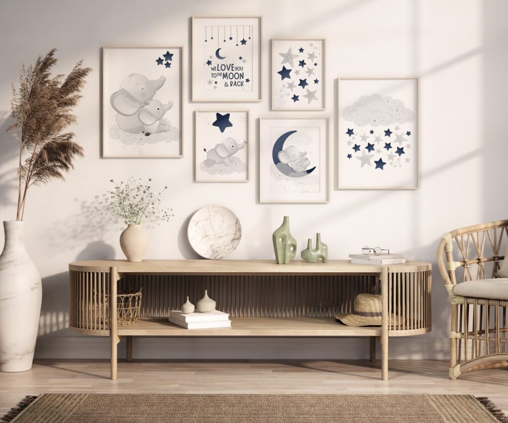 Nursery decor boy elephant, nursery wall art boy set of 6