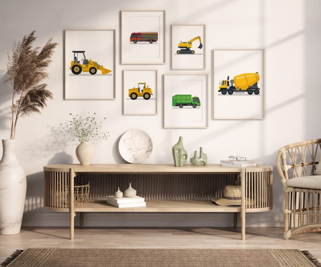 Set of 6 Vehicle Prints, Construction Wall Art, Transportation Print Nursery, Kids Gallery Wall Set, Truck Wall Art, Nursery Truck Prints