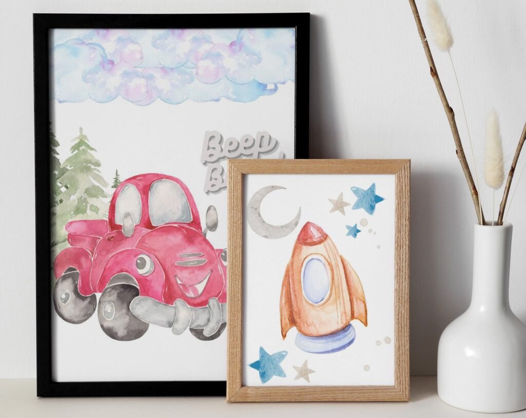 Our Car Nursery,Train, Rocket, Plane, transportation set of 2, soothing colors, and heartwarming quotes that are bound to bring joy and comfort to your baby’s room. Each print is thoughtfully crafted to add a touch of magic and wonder, making it an ideal gift for new parents or a special treat for your own bundle of joy.
