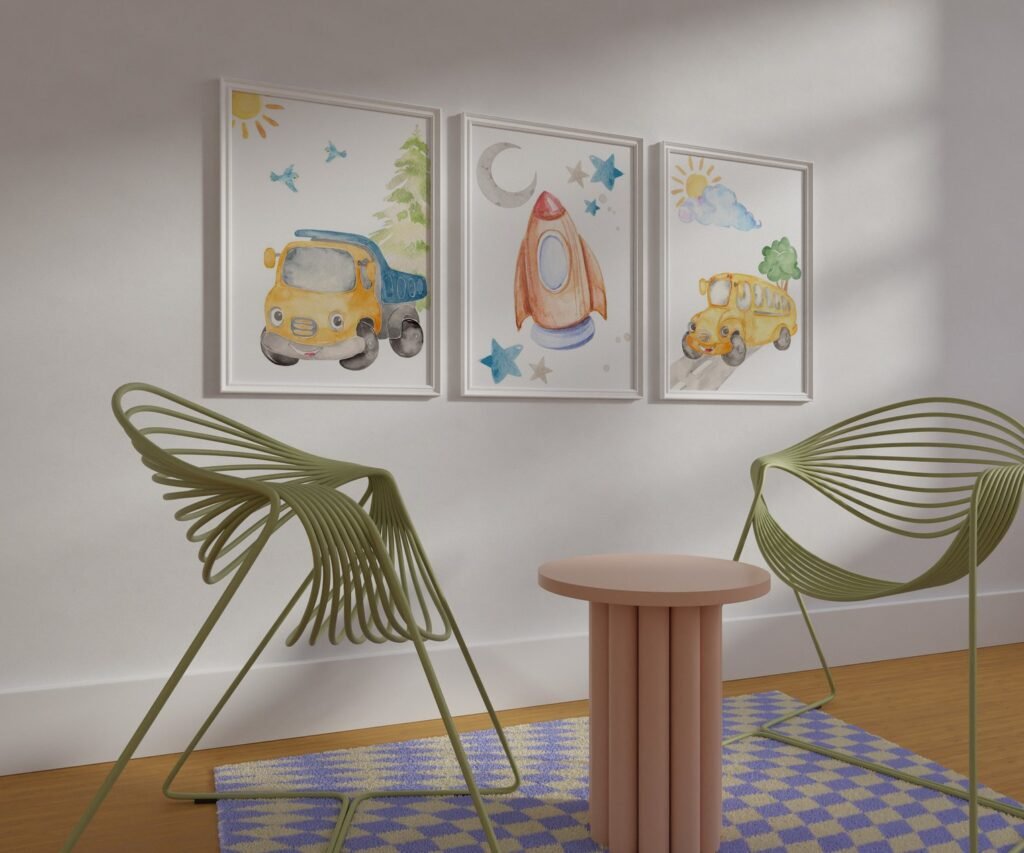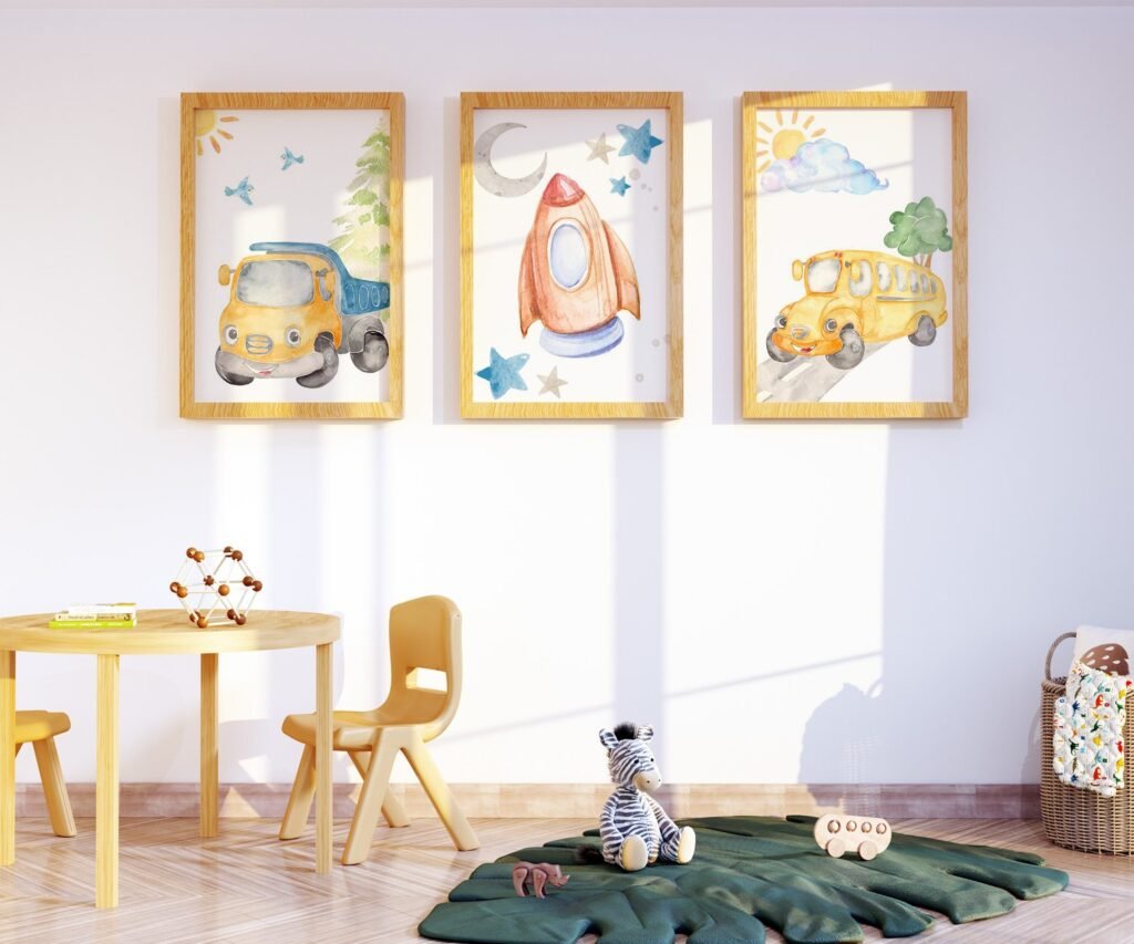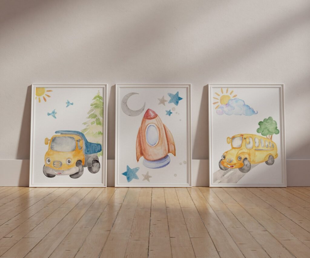 Our Car Nursery,Train, Rocket, Plane, transportation set of 3, soothing colors, and heartwarming quotes that are bound to bring joy and comfort to your baby’s room. Each print is thoughtfully crafted to add a touch of magic and wonder, making it an ideal gift for new parents or a special treat for your own bundle of joy.