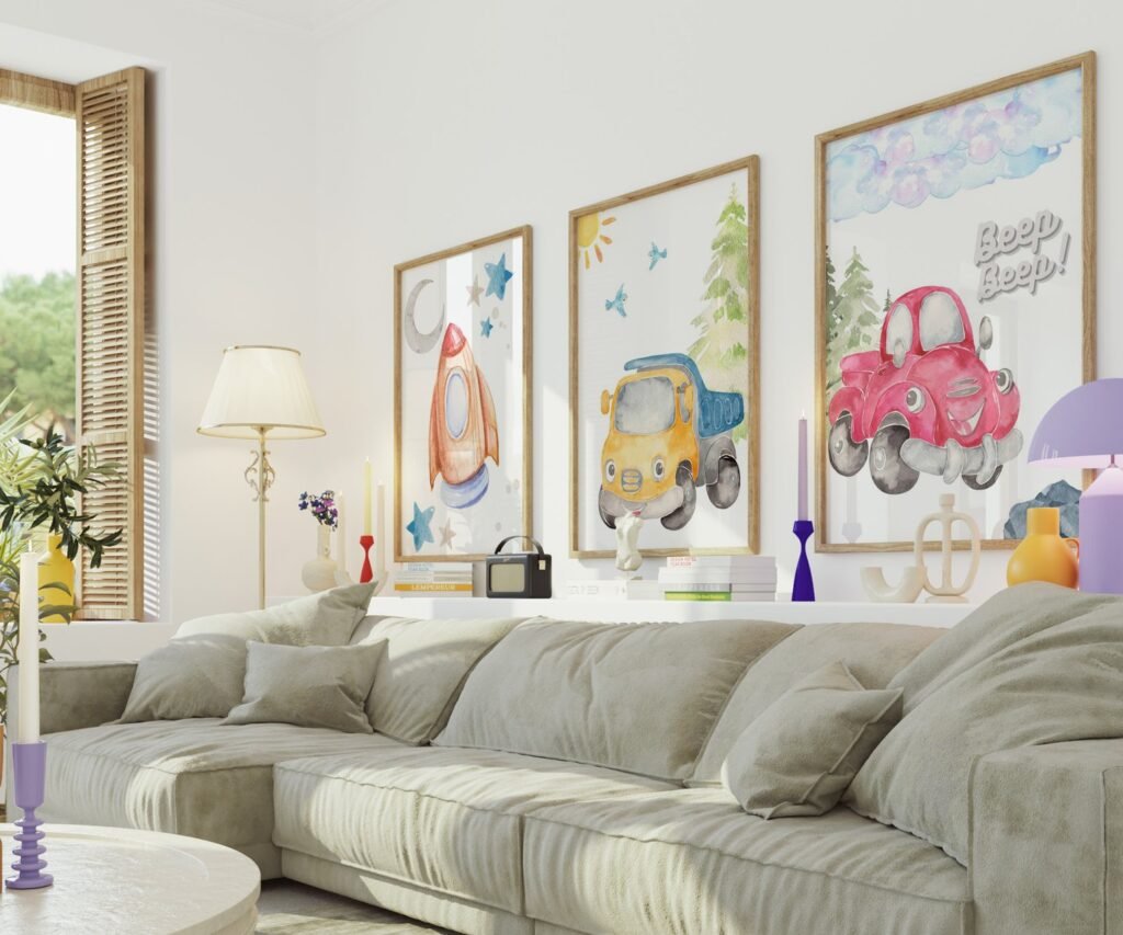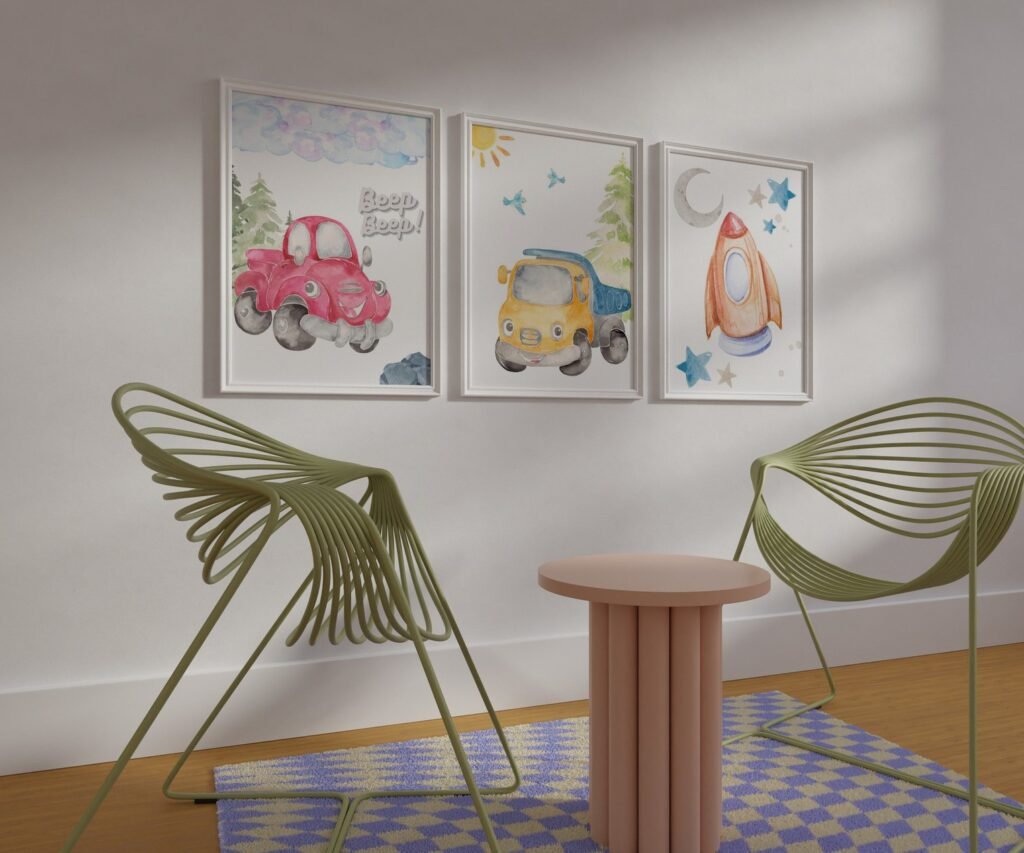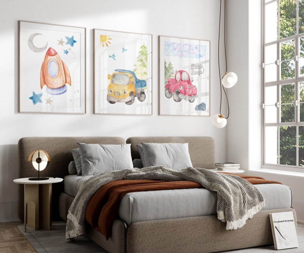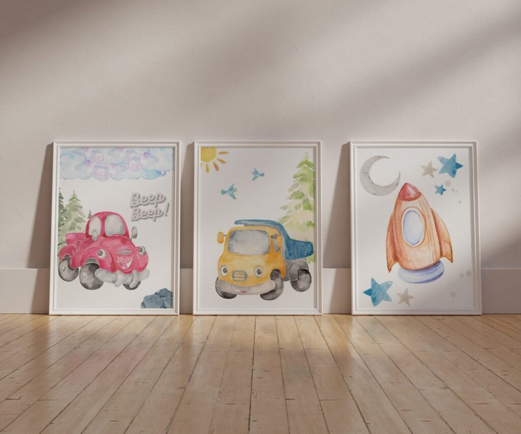 Our Car Nursery,Train, Rocket, Plane, transportation set of 3, soothing colors, and heartwarming quotes that are bound to bring joy and comfort to your baby’s room. Each print is thoughtfully crafted to add a touch of magic and wonder, making it an ideal gift for new parents or a special treat for your own bundle of joy.