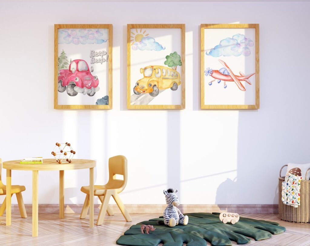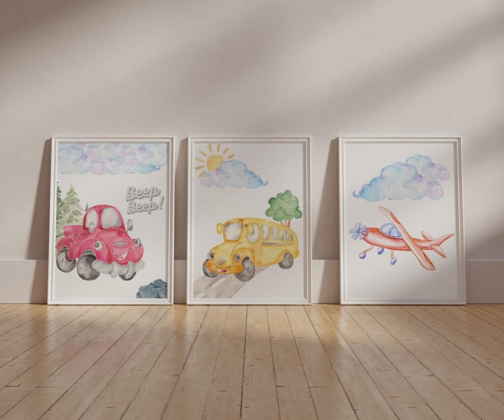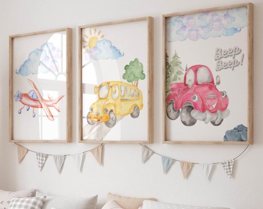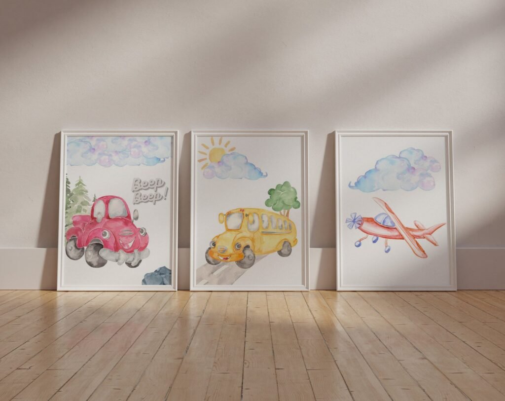 Our Car Nursery,Train, Rocket, Plane, transportation set of 3, soothing colors, and heartwarming quotes that are bound to bring joy and comfort to your baby’s room. Each print is thoughtfully crafted to add a touch of magic and wonder, making it an ideal gift for new parents or a special treat for your own bundle of joy.
