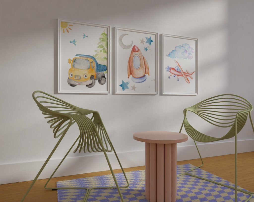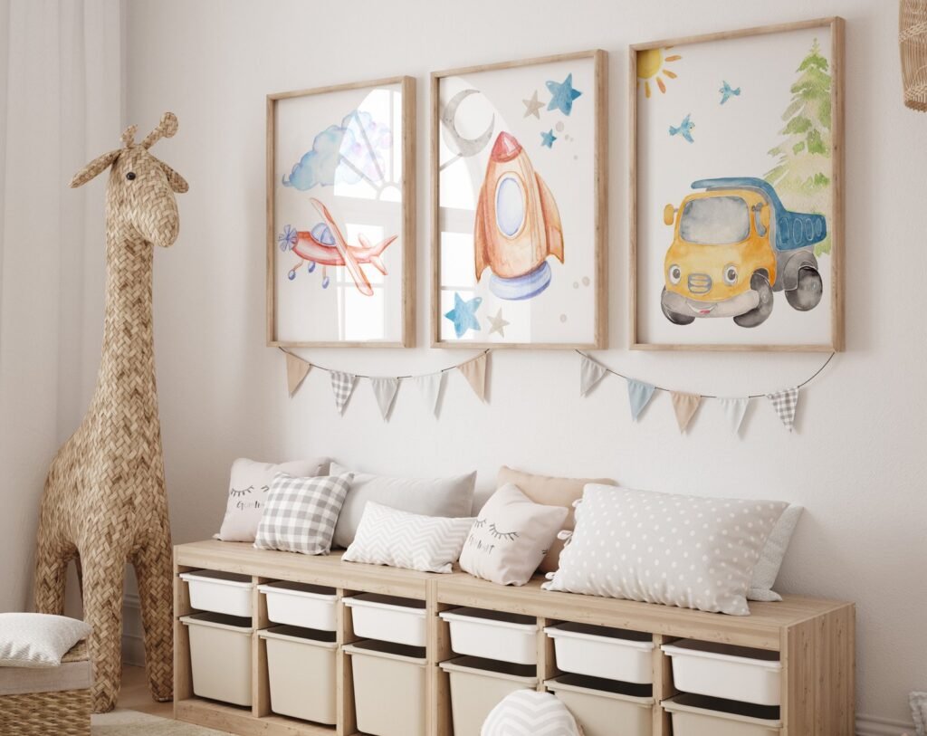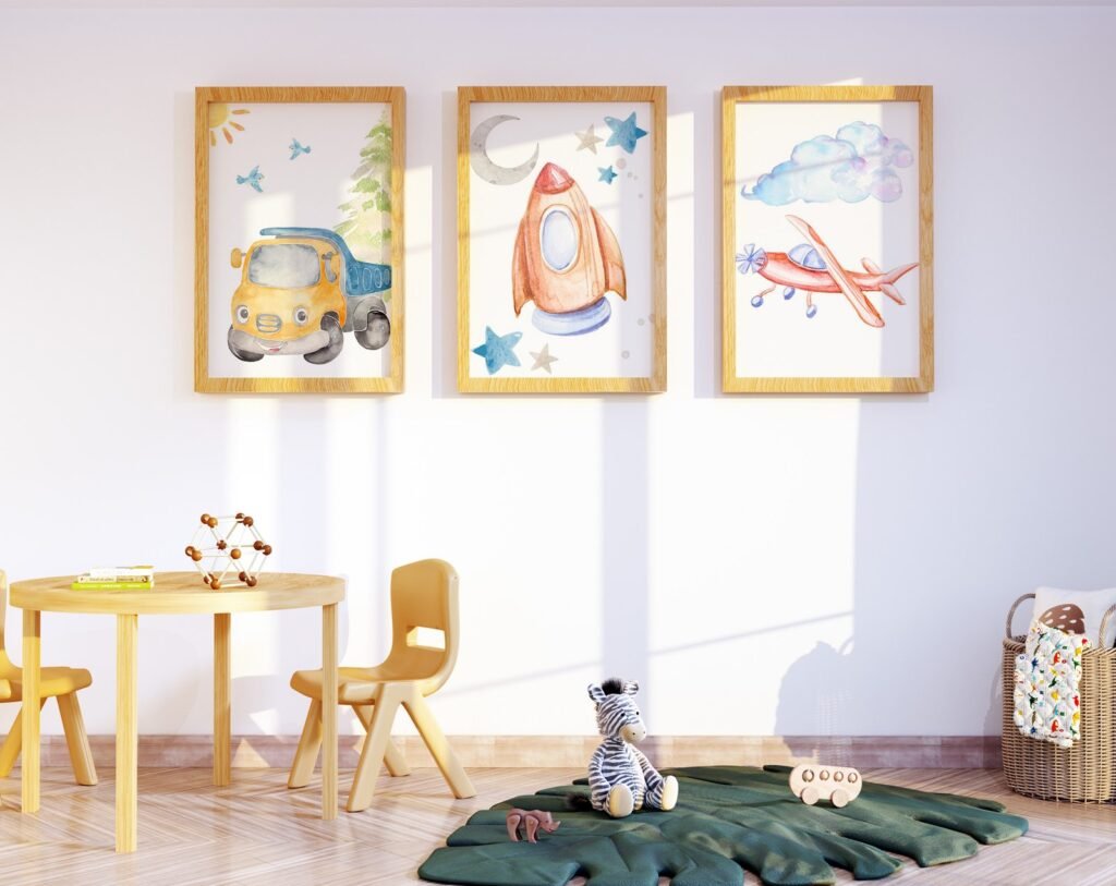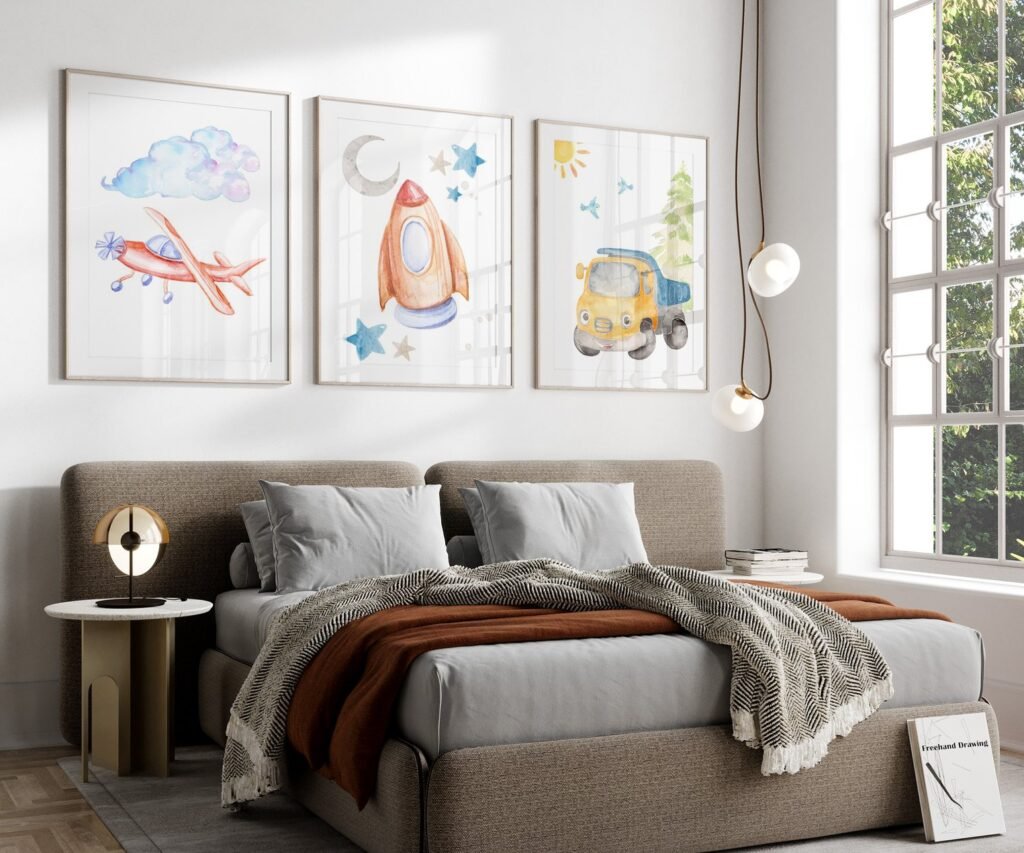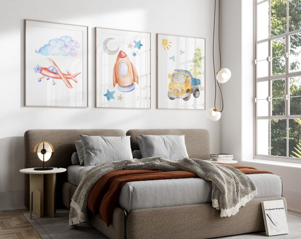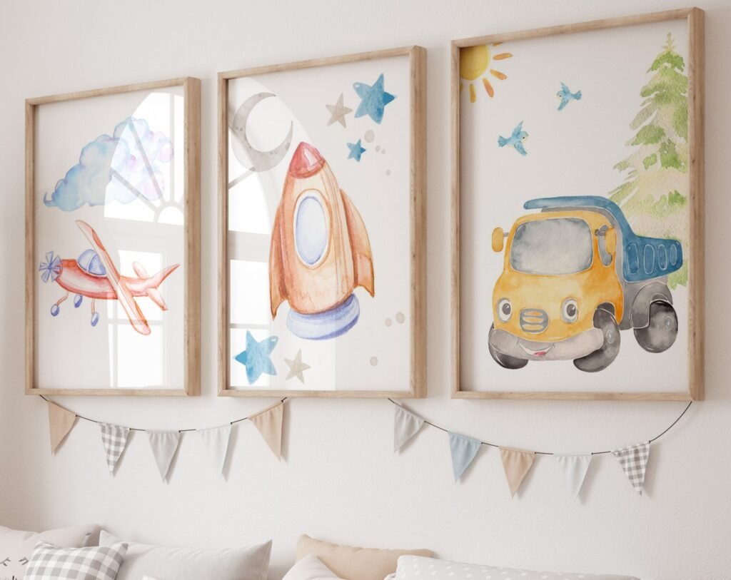 Our Car Nursery,Train, Rocket, Plane, transportation set of 3, soothing colors, and heartwarming quotes that are bound to bring joy and comfort to your baby’s room. Each print is thoughtfully crafted to add a touch of magic and wonder, making it an ideal gift for new parents or a special treat for your own bundle of joy.