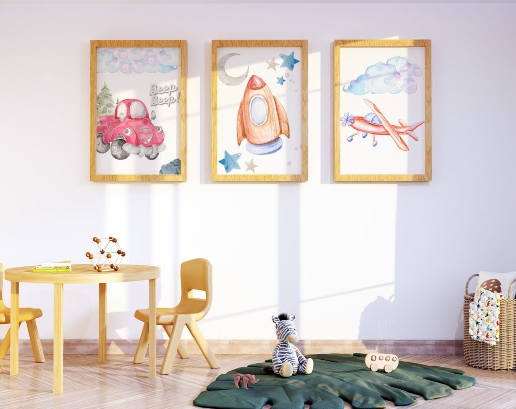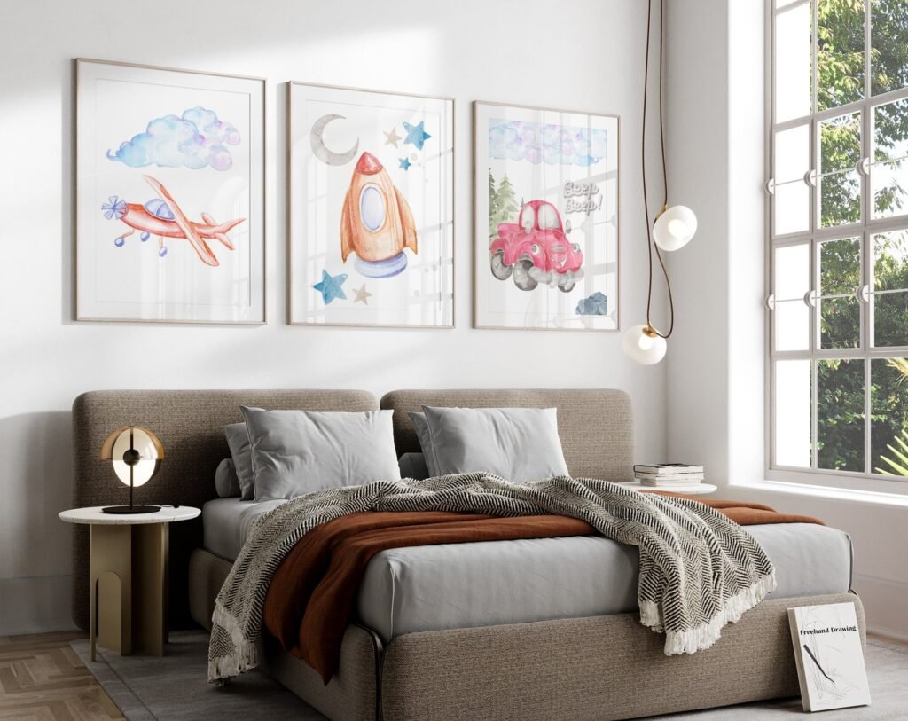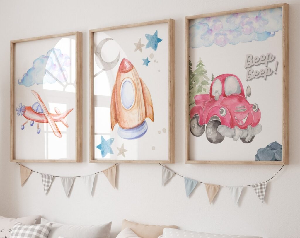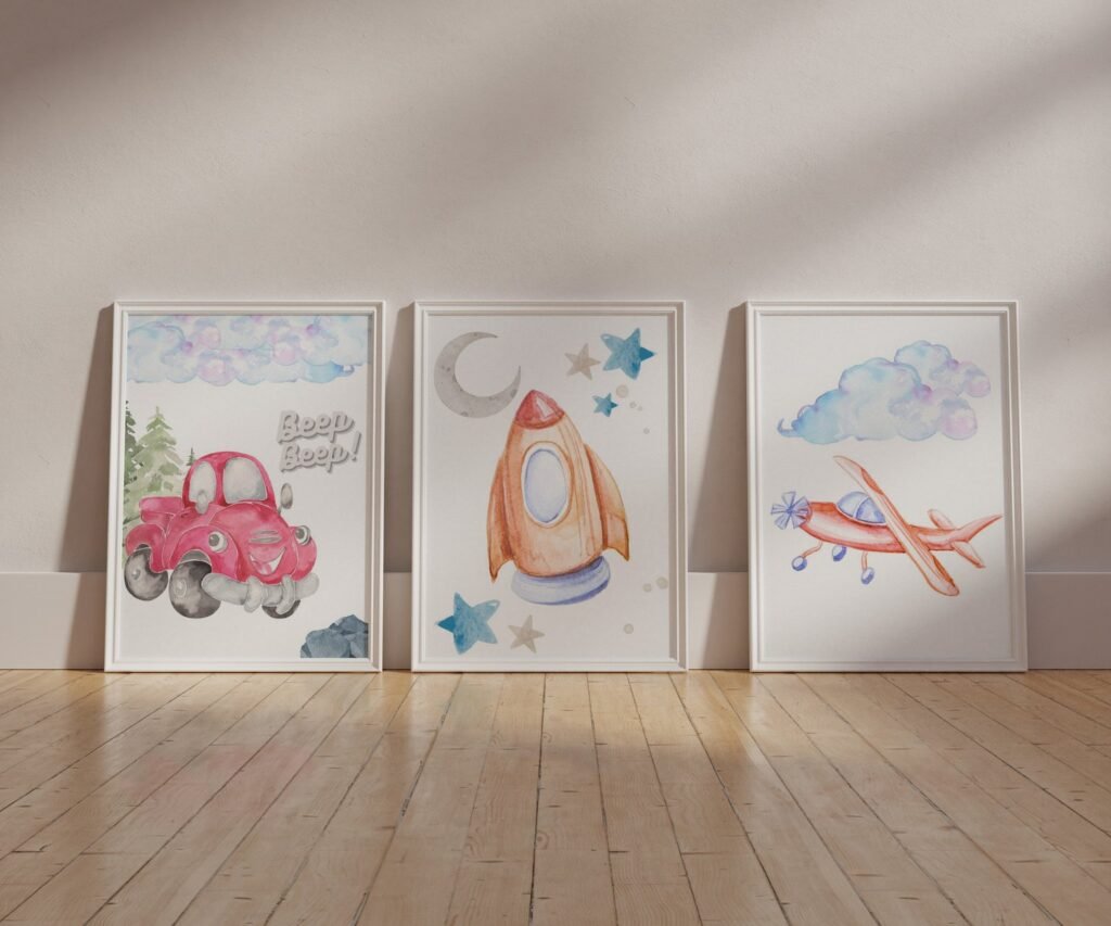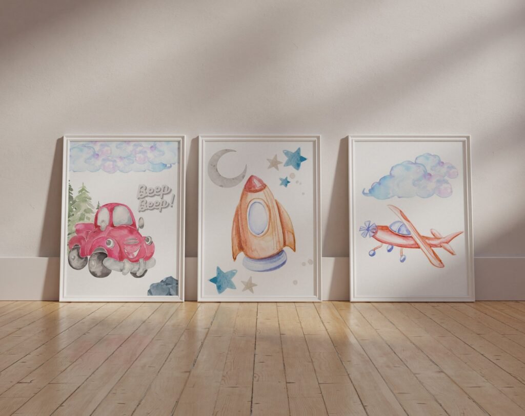 Our Car Nursery,Train, Rocket, Plane, transportation set of 3, soothing colors, and heartwarming quotes that are bound to bring joy and comfort to your baby’s room. Each print is thoughtfully crafted to add a touch of magic and wonder, making it an ideal gift for new parents or a special treat for your own bundle of joy.