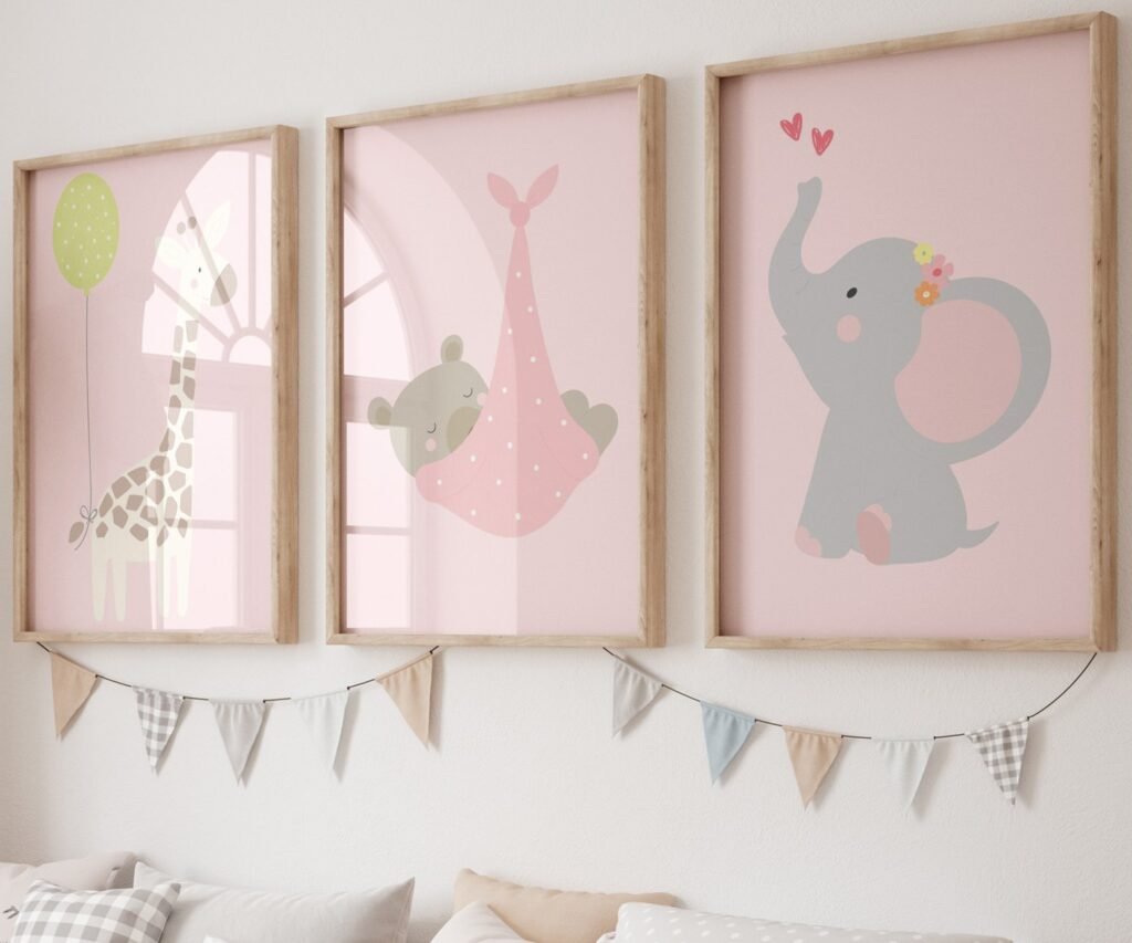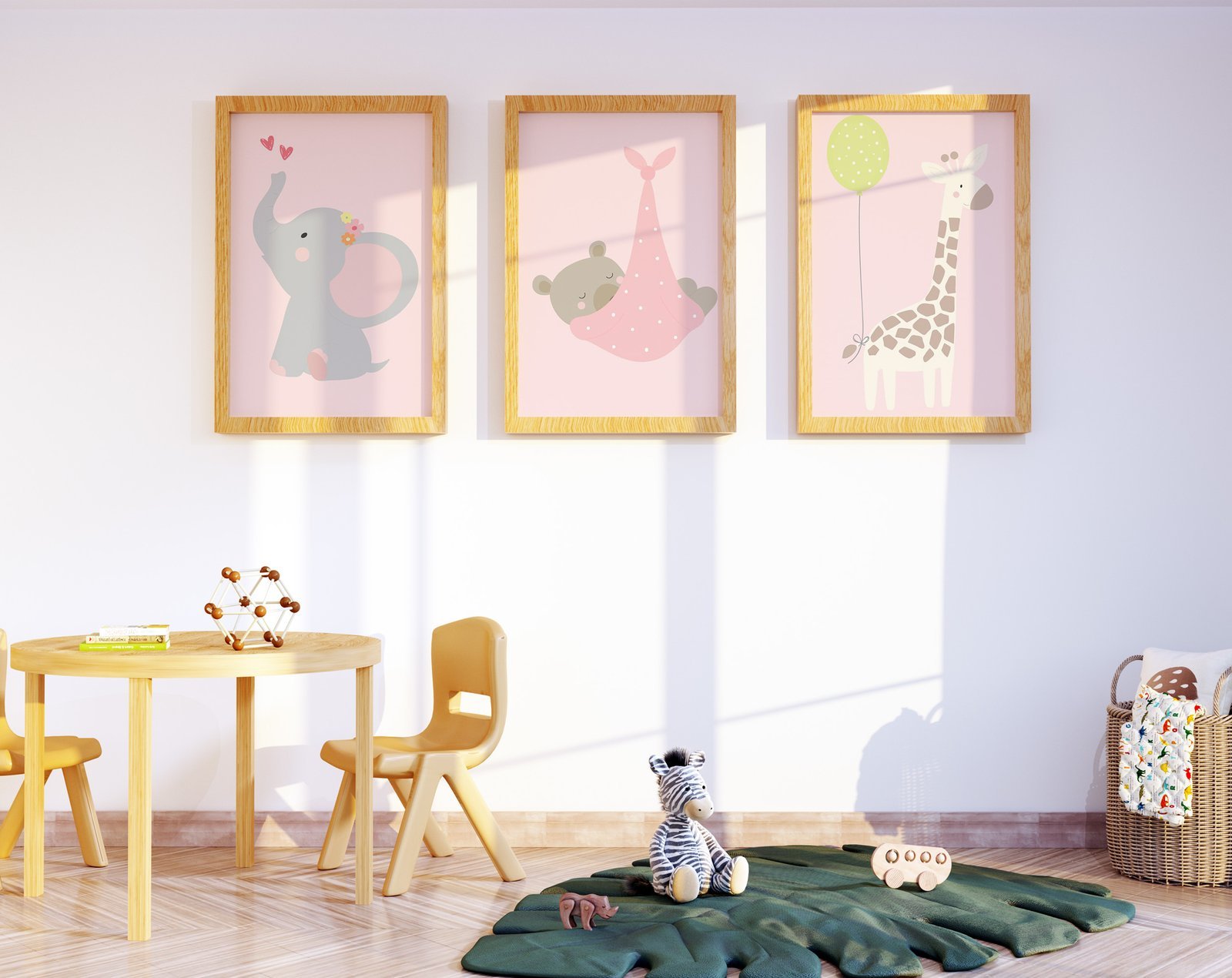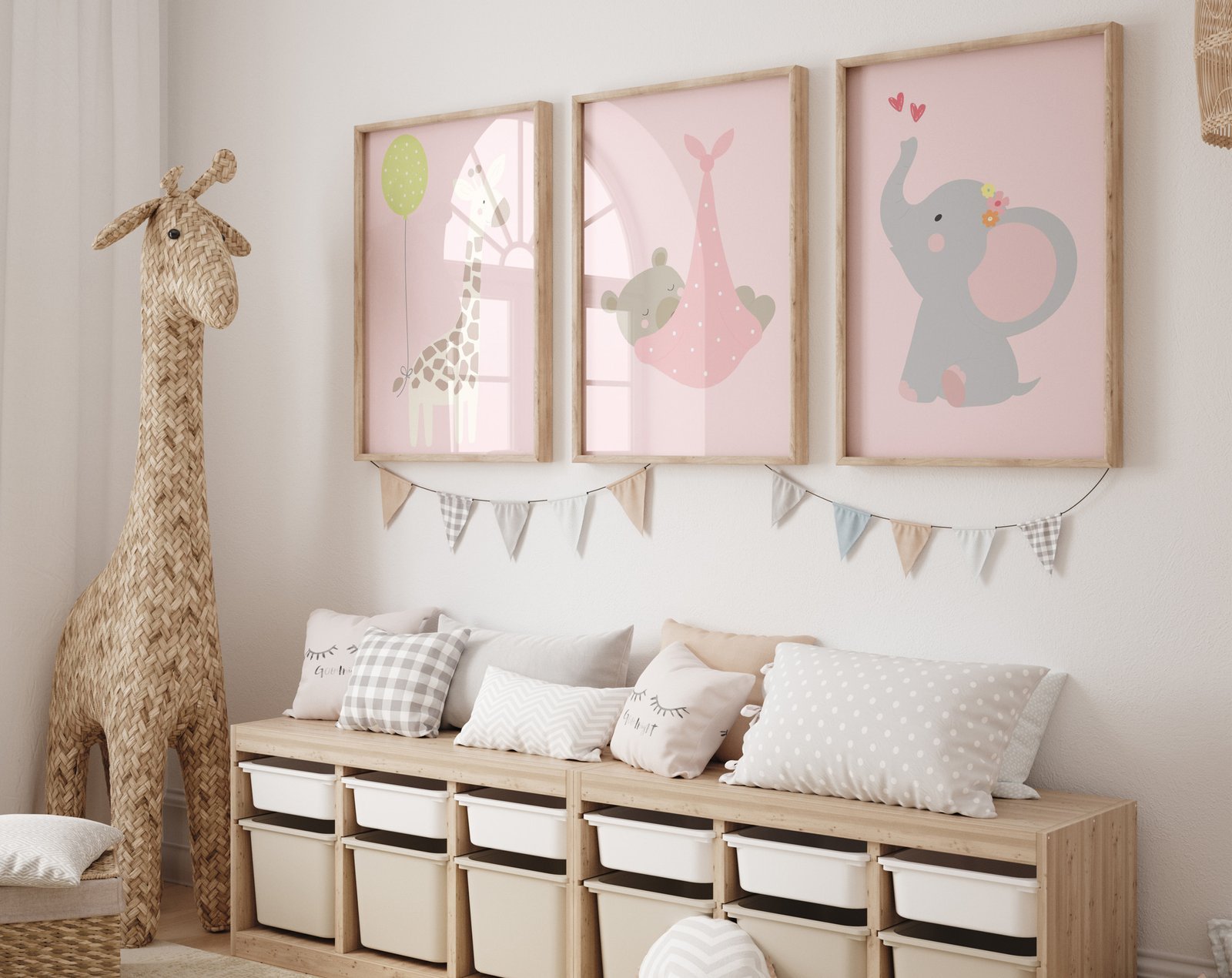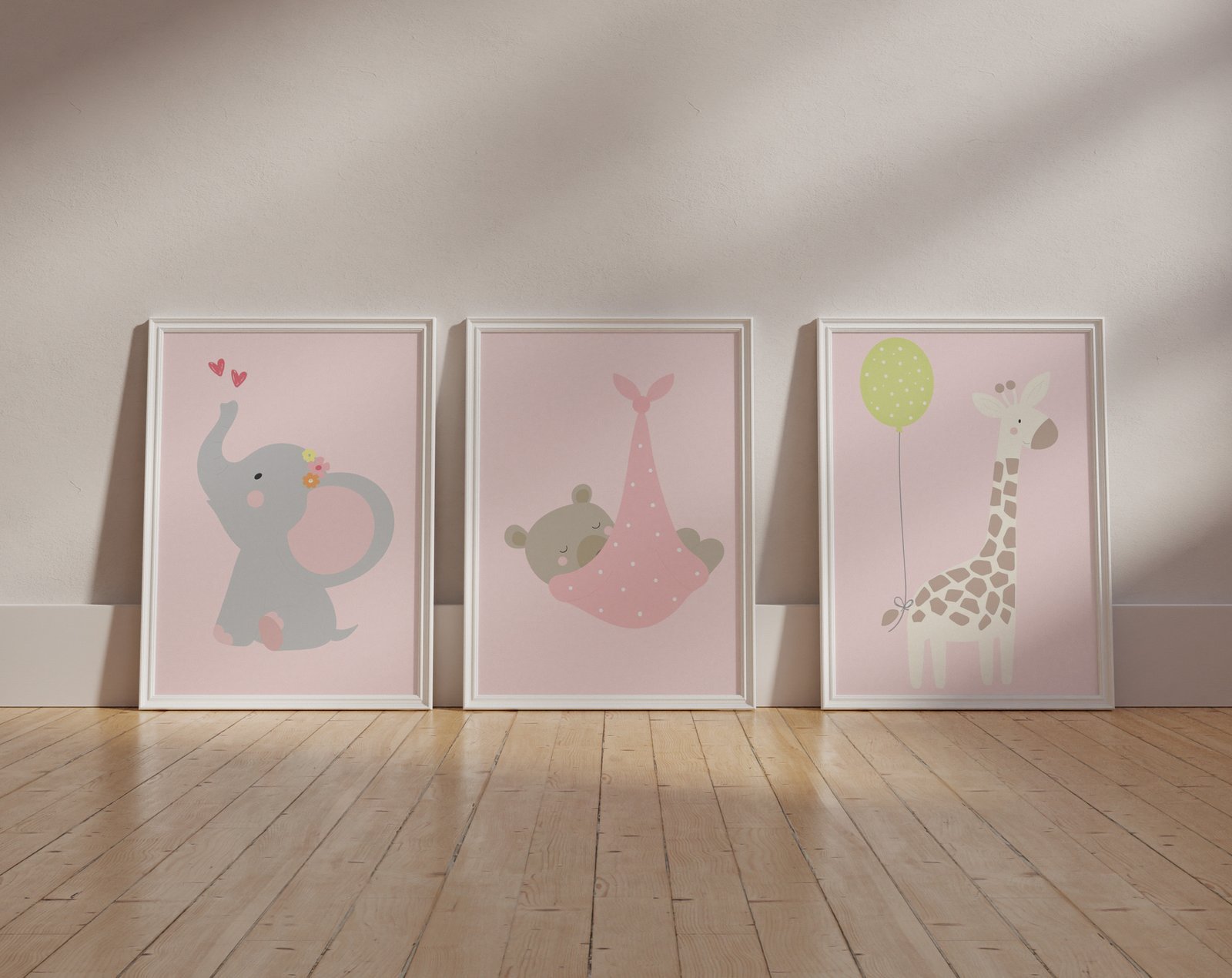 Girl Nursery wall art animals, pink baby room decor, bear, elephant, giraffe, safari animals set of 3