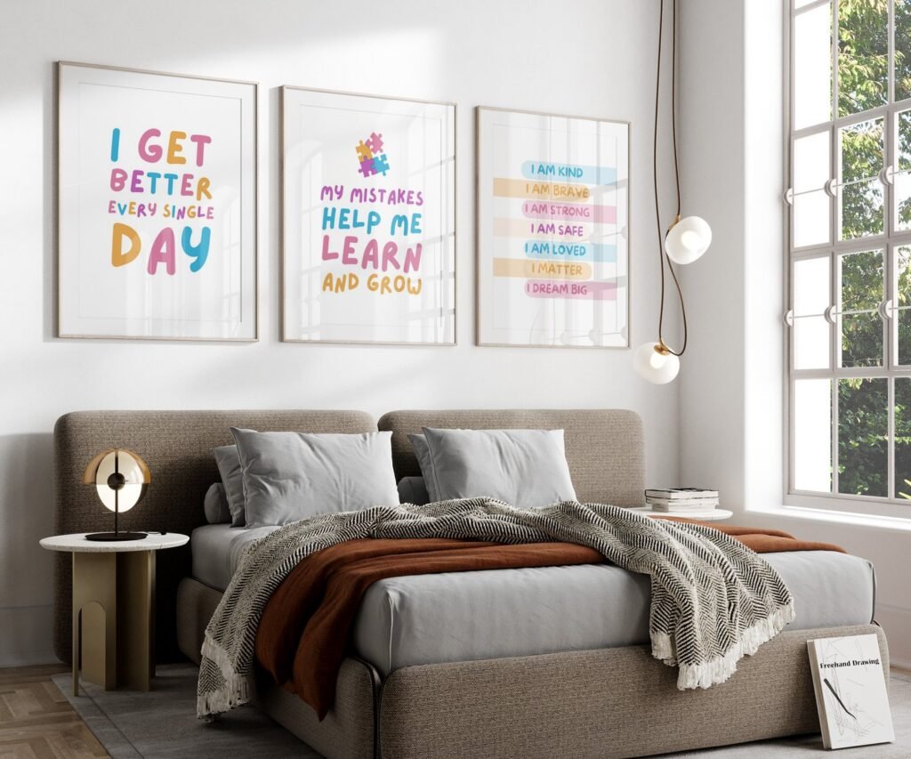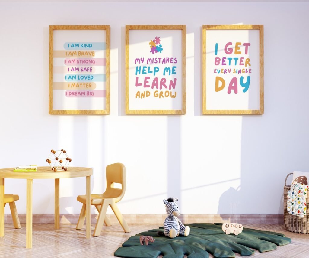 Our kids quote kids Positive Affirmations set of 3, soothing colors, and heartwarming quotes that are bound to bring joy and comfort to your baby’s room. Each print is thoughtfully crafted to add a touch of magic and wonder, making it an ideal gift for new parents or a special treat for your own bundle of joy.