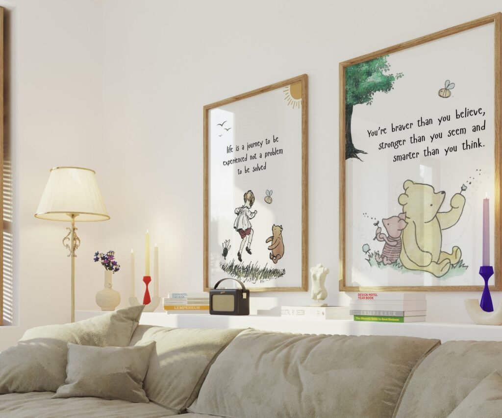 Our kids Quote Winnie the Pooh, set of 2, soothing colors, and heartwarming quotes that are bound to bring joy and comfort to your baby’s room. Each print is thoughtfully crafted to add a touch of magic and wonder, making it an ideal gift for new parents or a special treat for your own bundle of joy.