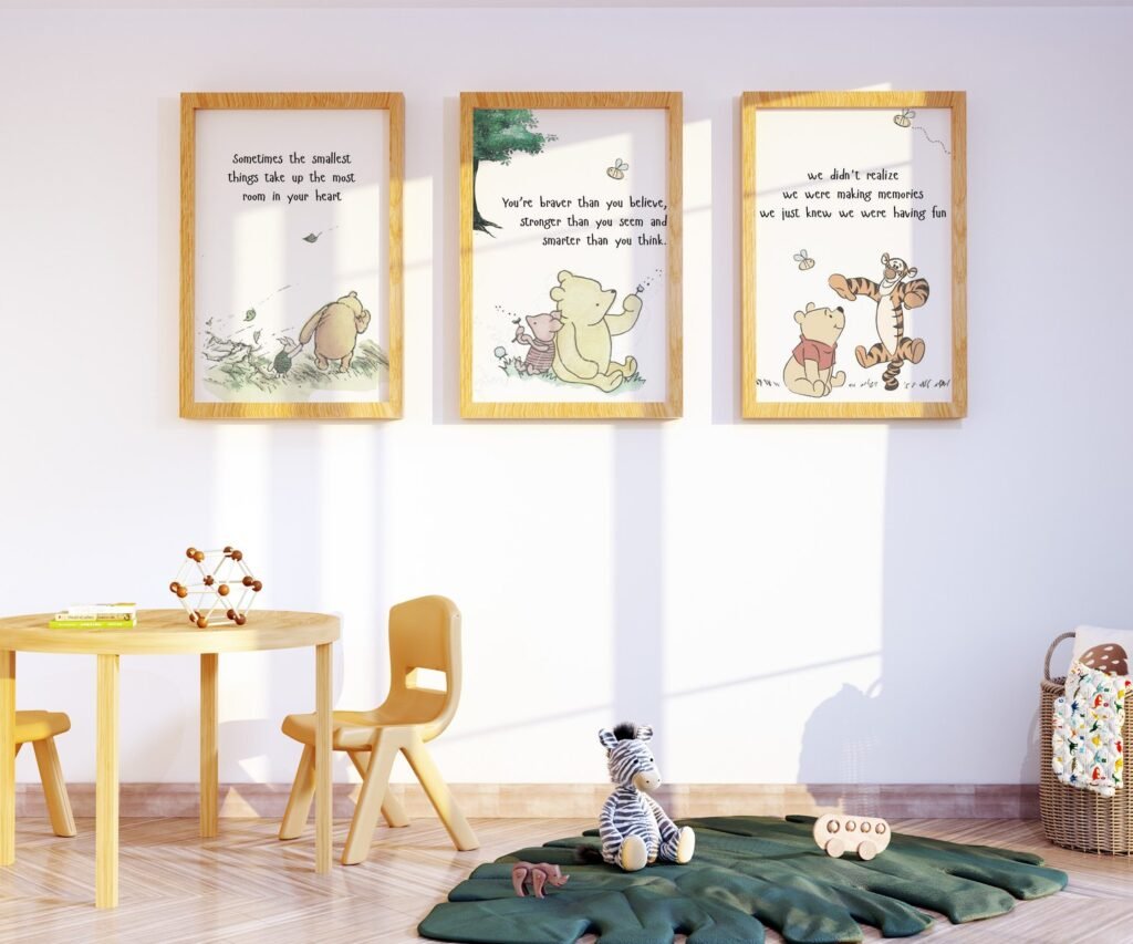 Our kids Quote Winnie the Pooh, set of 3, soothing colors, and heartwarming quotes that are bound to bring joy and comfort to your baby’s room. Each print is thoughtfully crafted to add a touch of magic and wonder, making it an ideal gift for new parents or a special treat for your own bundle of joy.