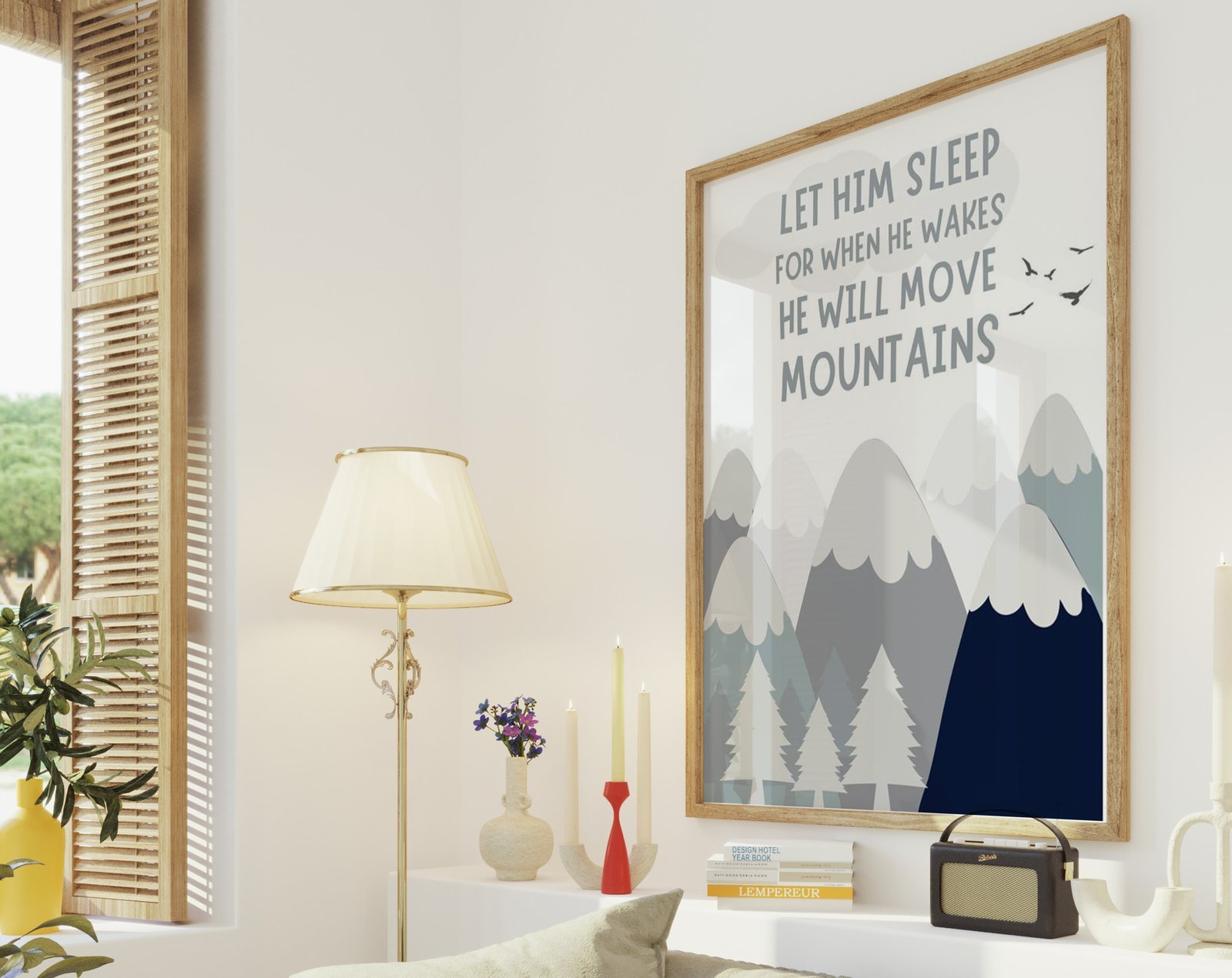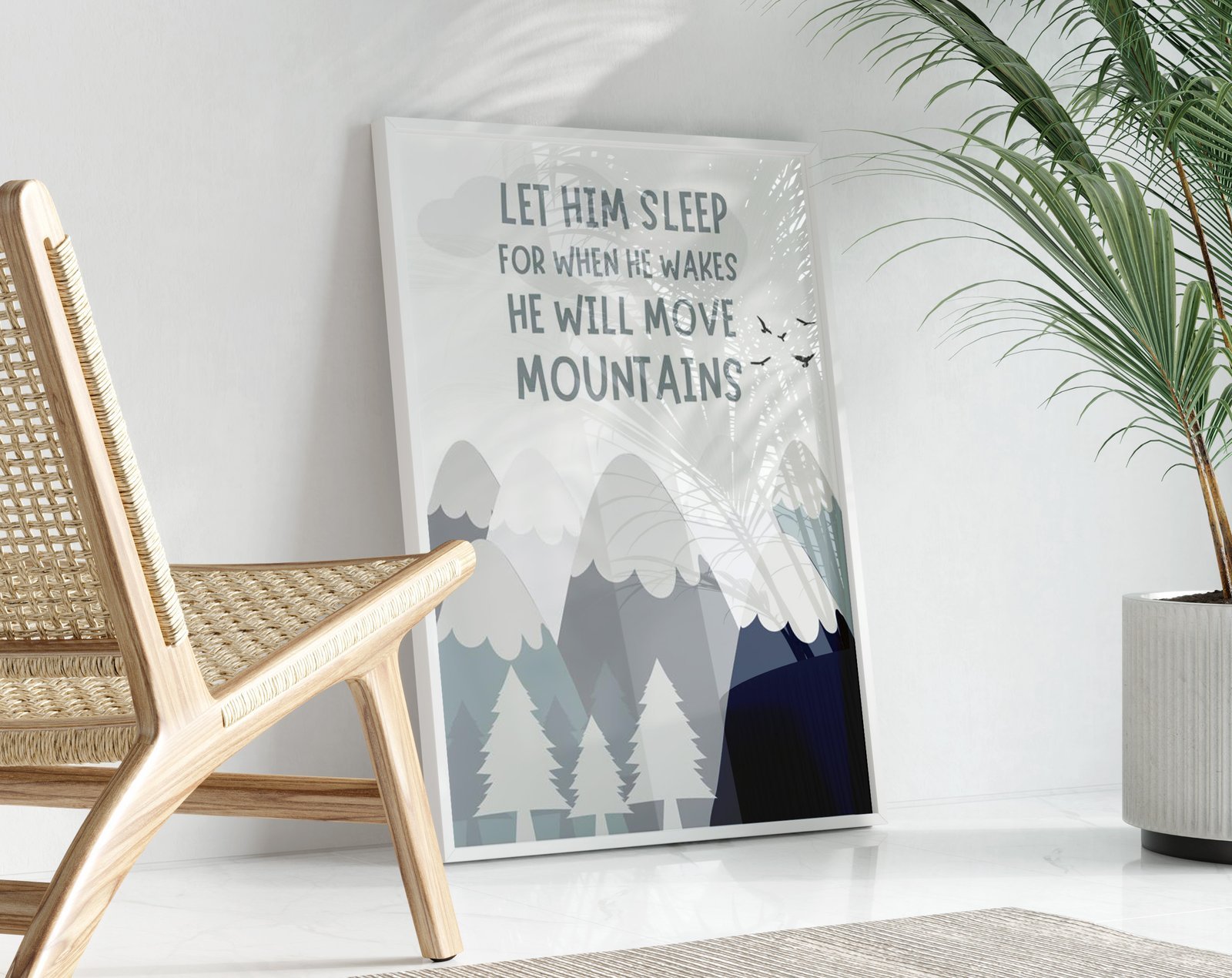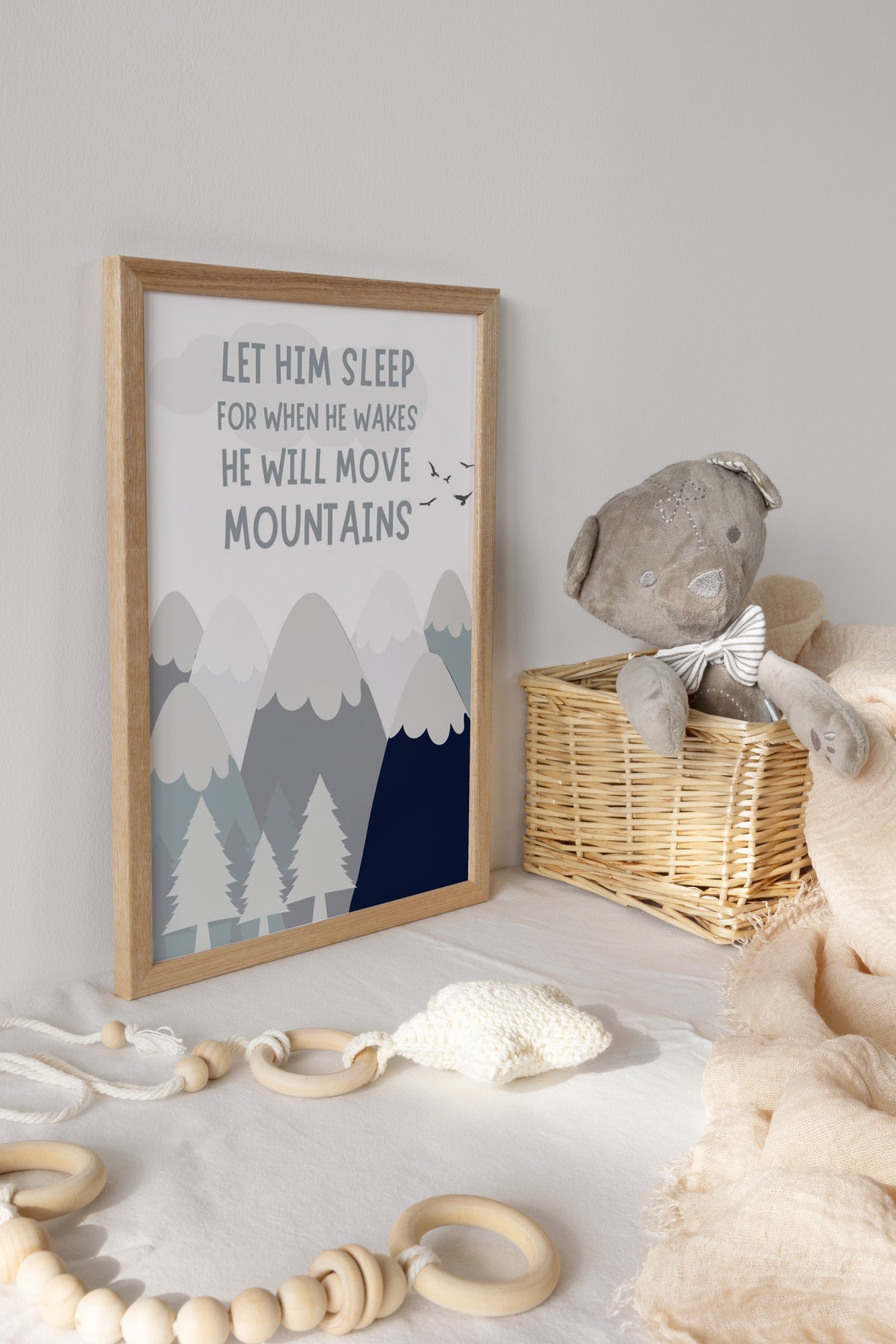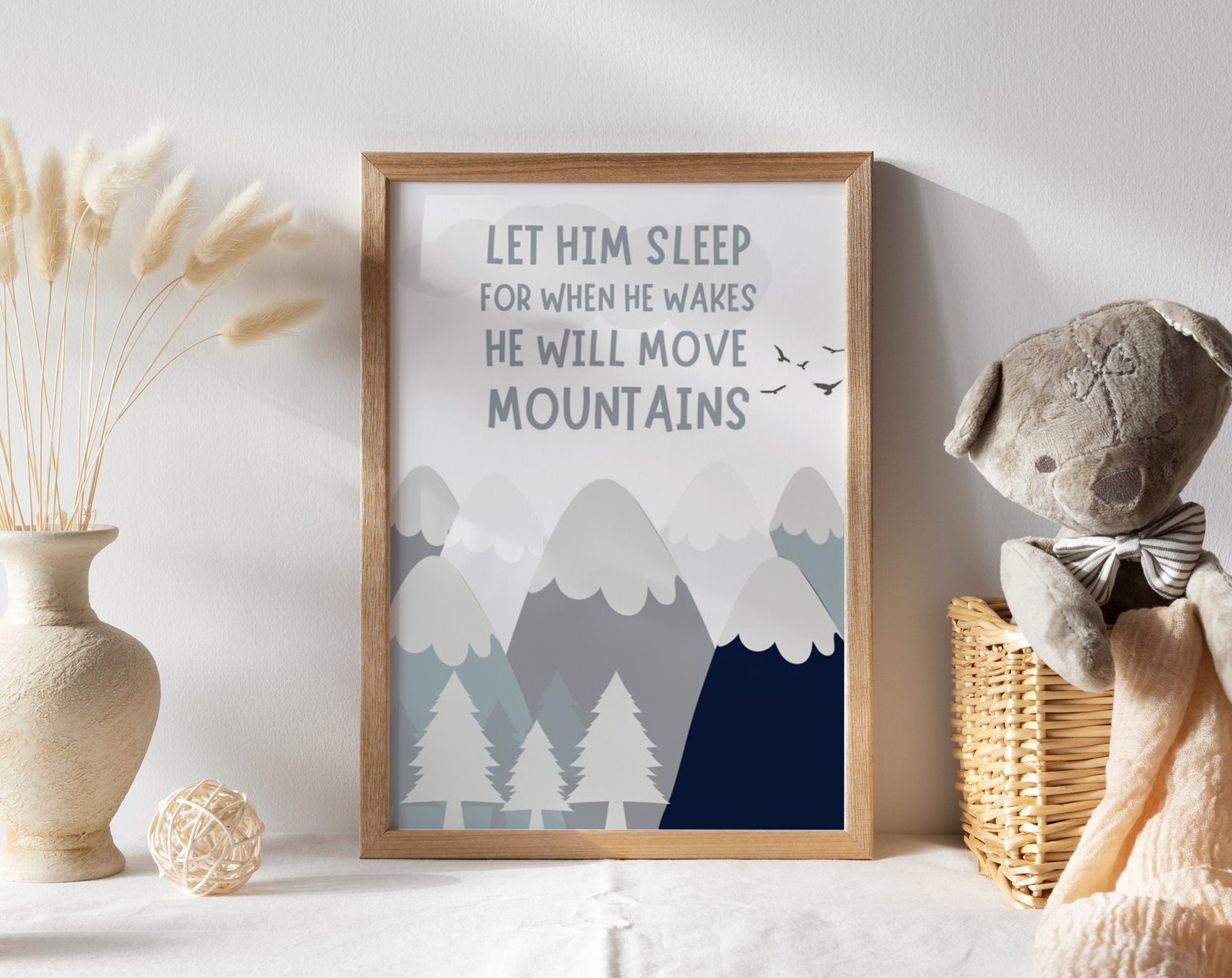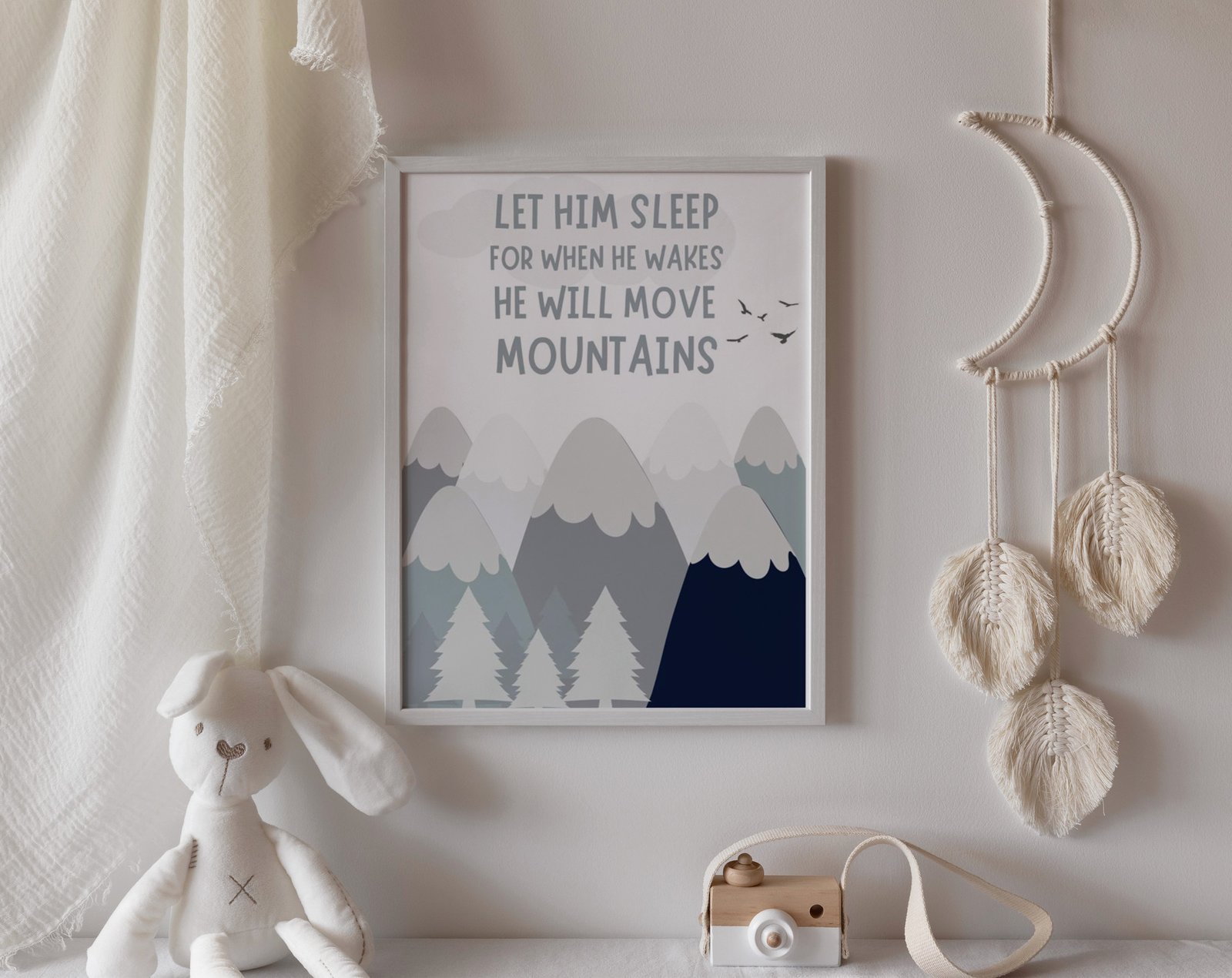 Our Let him sleep for when he wakes he will move mountains, mountains adventure, woodland set of 1, soothing colors, and heartwarming quotes that are bound to bring joy and comfort to your baby’s room. Each print is thoughtfully crafted to add a touch of magic and wonder, making it an ideal gift for new parents or a special treat for your own bundle of joy.