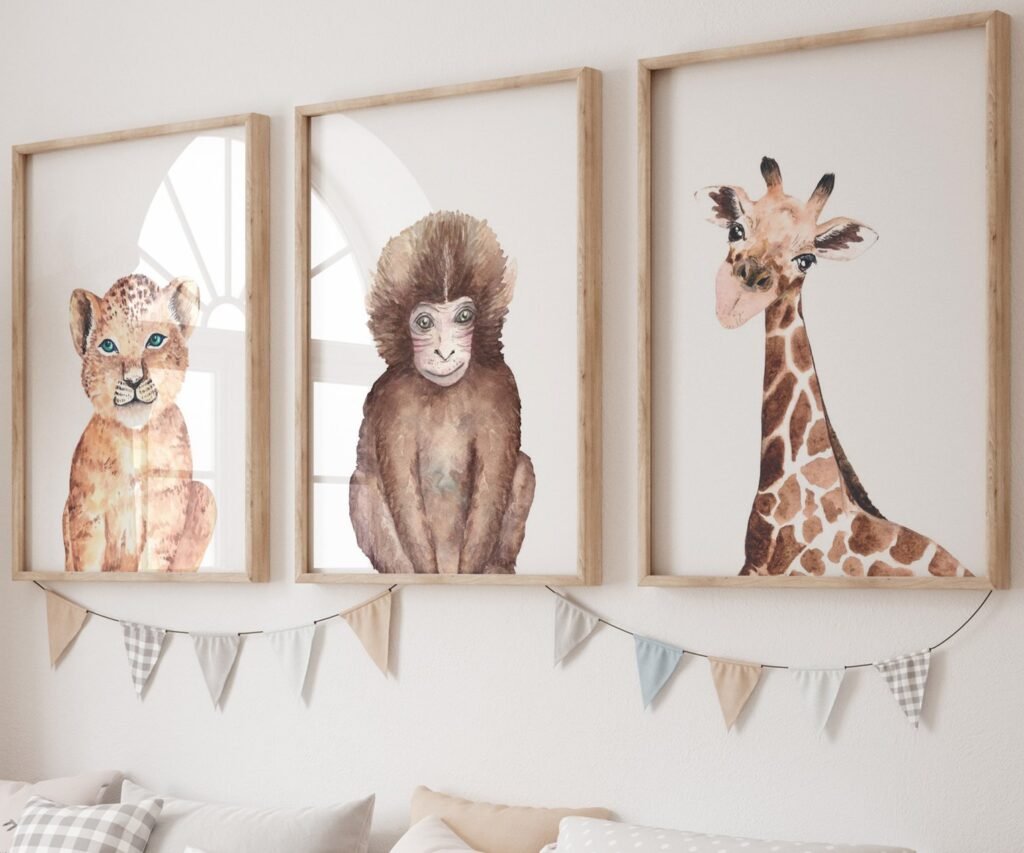 Our Lion tiger monkey giraffe elephant set of 3, Woodland Baby Animal Posters, soothing colors, and heartwarming quotes that are bound to bring joy and comfort to your baby’s room. Each print is thoughtfully crafted to add a touch of magic and wonder, making it an ideal gift for new parents or a special treat for your own bundle of joy.