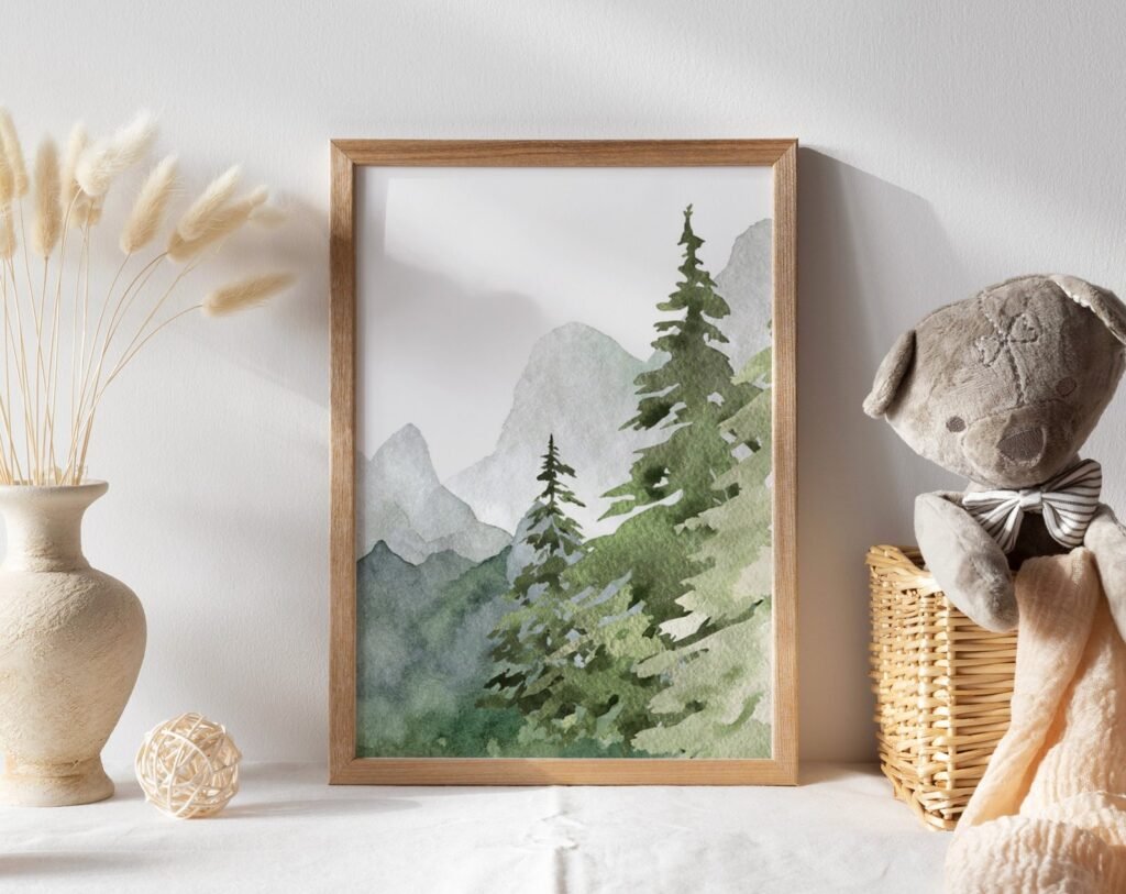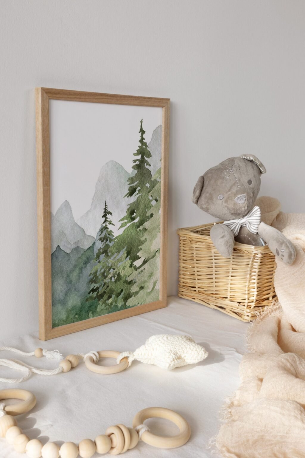 mountain, nursery wall art, tree nursery adventure nursery, forest, sage green,woodland animals set of 1