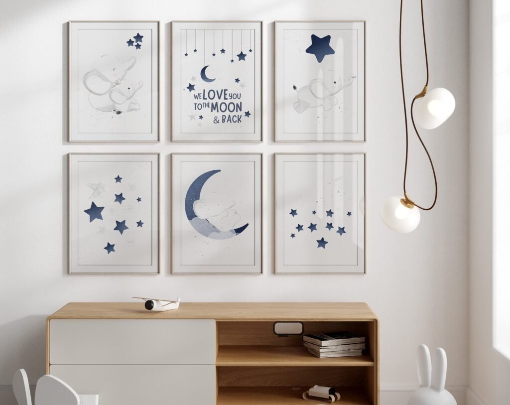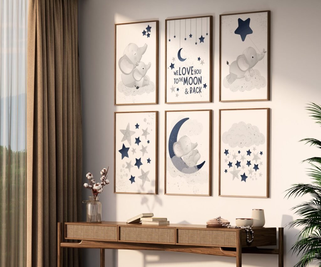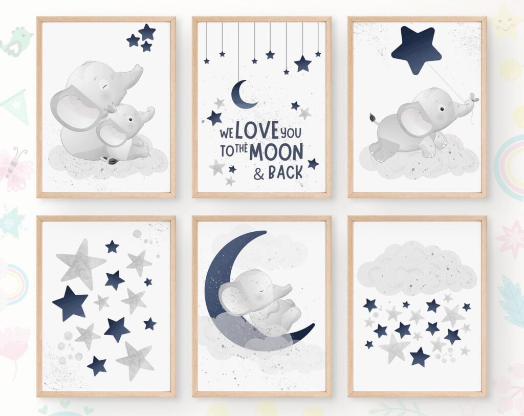 Our Nursery decor boy elephant, nursery wall art boy set of 6, soothing colors, and heartwarming quotes that are bound to bring joy and comfort to your baby’s room. Each print is thoughtfully crafted to add a touch of magic and wonder, making it an ideal gift for new parents or a special treat for your own bundle of joy.