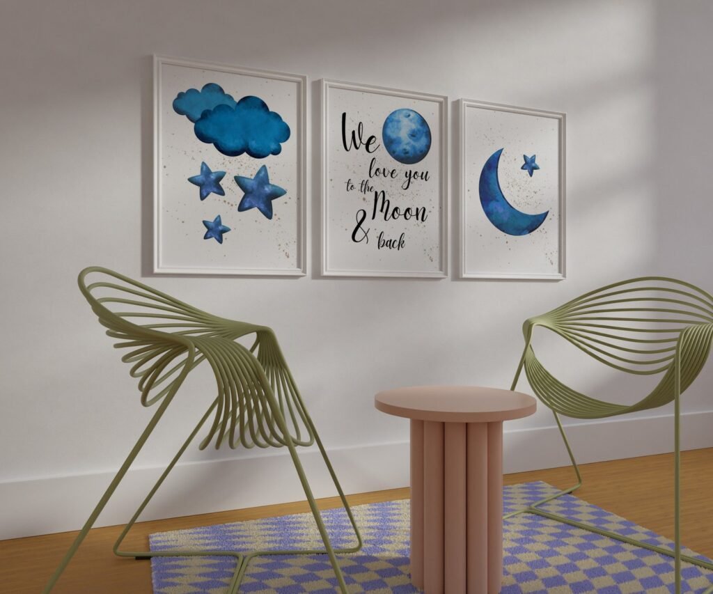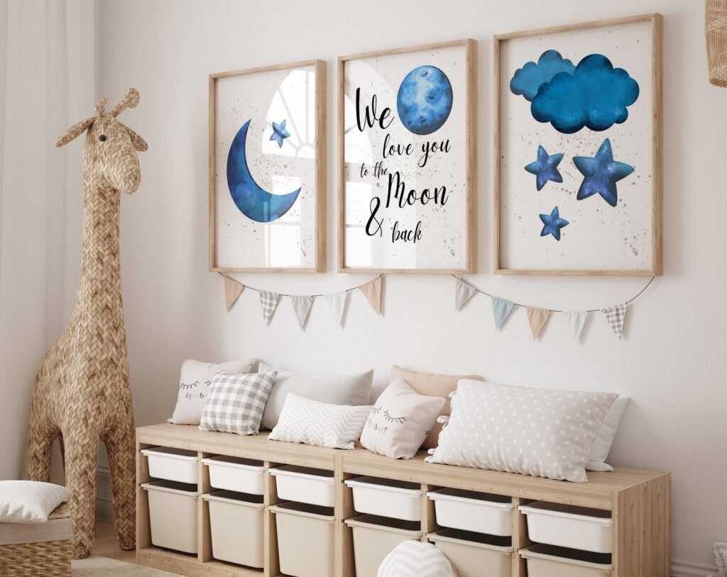 Our Nursery decor boy navy blue, Nursery wall art boy, moon and stars, we love you to the moon and back set of 3, soothing colors, and heartwarming quotes that are bound to bring joy and comfort to your baby’s room. Each print is thoughtfully crafted to add a touch of magic and wonder, making it an ideal gift for new parents or a special treat for your own bundle of joy.