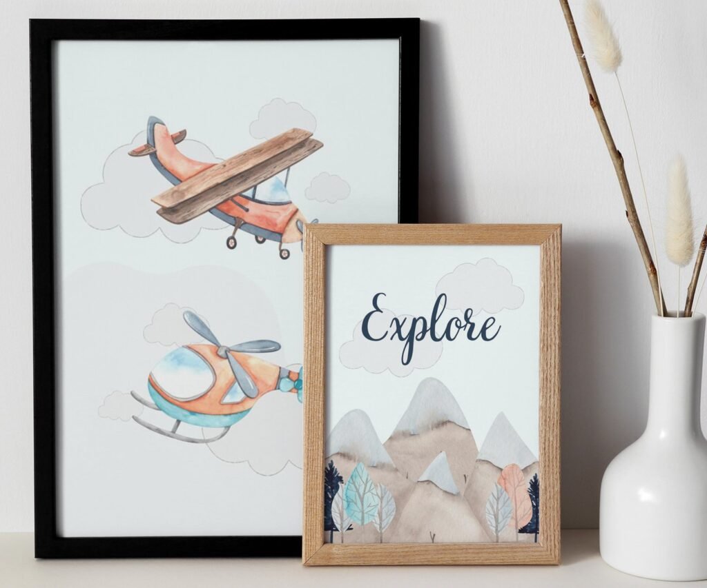 Our Nursery decor mountain, adventure nursery, travel nursery, gender neutral, explore, hot air balloon, plane set of 2, soothing colors, and heartwarming quotes that are bound to bring joy and comfort to your baby’s room. Each print is thoughtfully crafted to add a touch of magic and wonder, making it an ideal gift for new parents or a special treat for your own bundle of joy.
