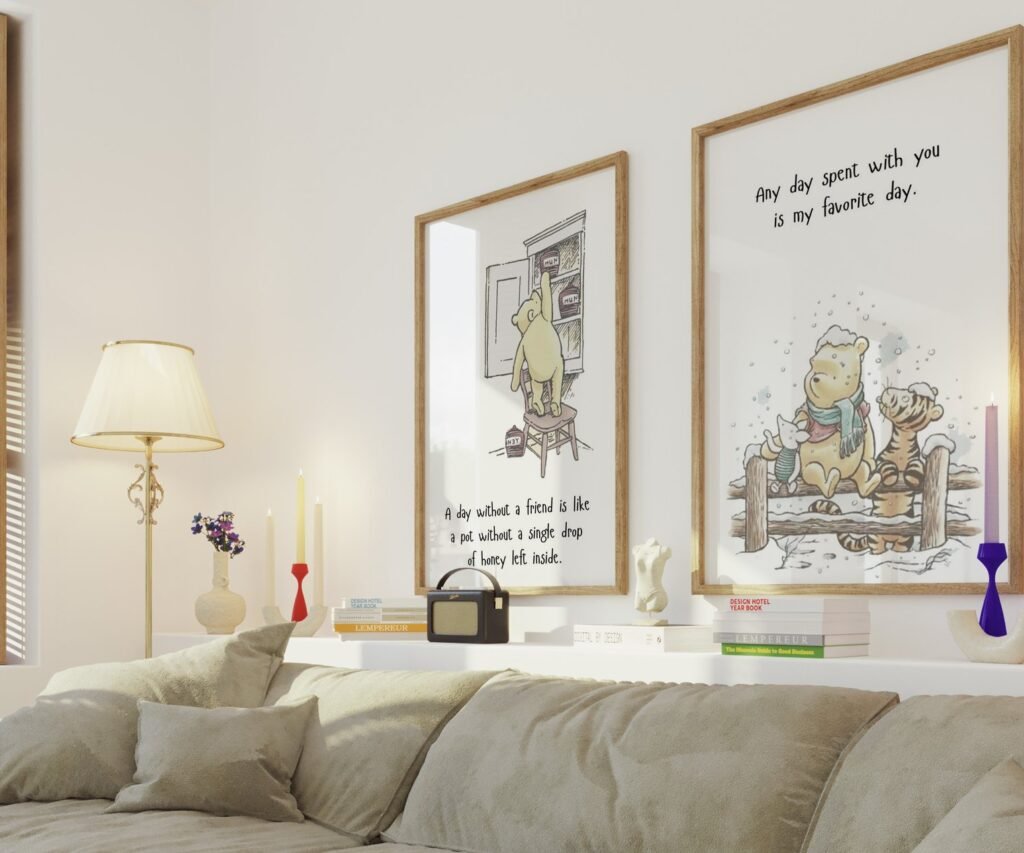 Our Quote Prints Winnie the Pooh, set of 2, soothing colors, and heartwarming quotes that are bound to bring joy and comfort to your baby’s room. Each print is thoughtfully crafted to add a touch of magic and wonder, making it an ideal gift for new parents or a special treat for your own bundle of joy.