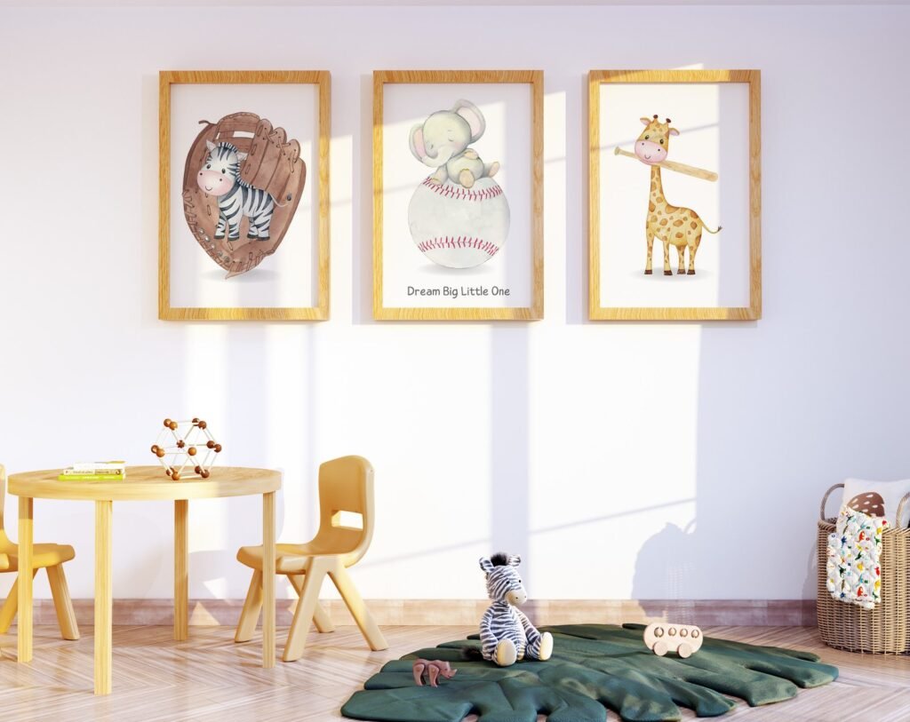 Our set of 3 Baseball nursery decor, Baby boy sports nursery, Animal sports, Baseball print set, Nursery sports decor, Baseball posters, soothing colors, and heartwarming quotes that are bound to bring joy and comfort to your baby’s room. Each print is thoughtfully crafted to add a touch of magic and wonder, making it an ideal gift for new parents or a special treat for your own bundle of joy.