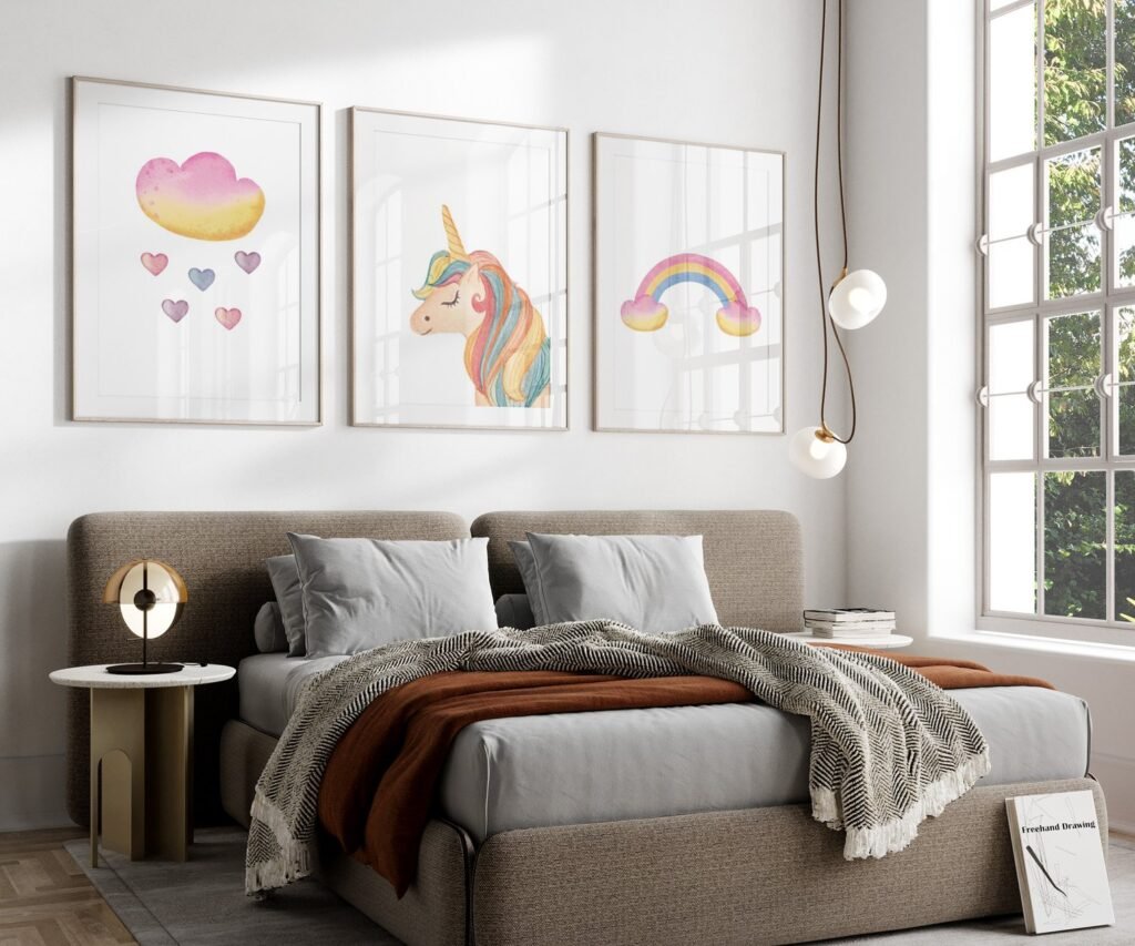 Our set of 3 Unicorn wall art set, Printable unicorn art, Girls room decor, Unicorn gold glitter, Unicorn prints,cloud rainbow, soothing colors, and heartwarming quotes that are bound to bring joy and comfort to your baby’s room. Each print is thoughtfully crafted to add a touch of magic and wonder, making it an ideal gift for new parents or a special treat for your own bundle of joy.