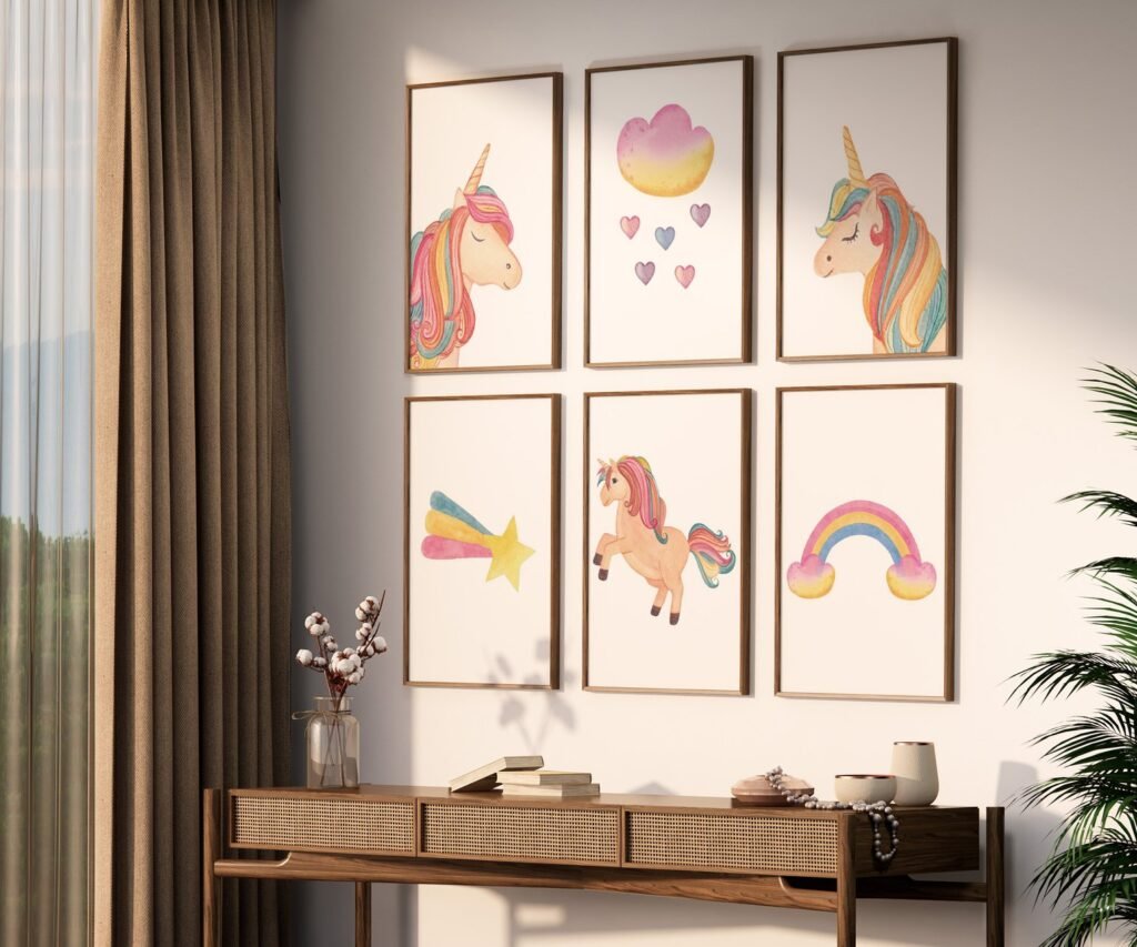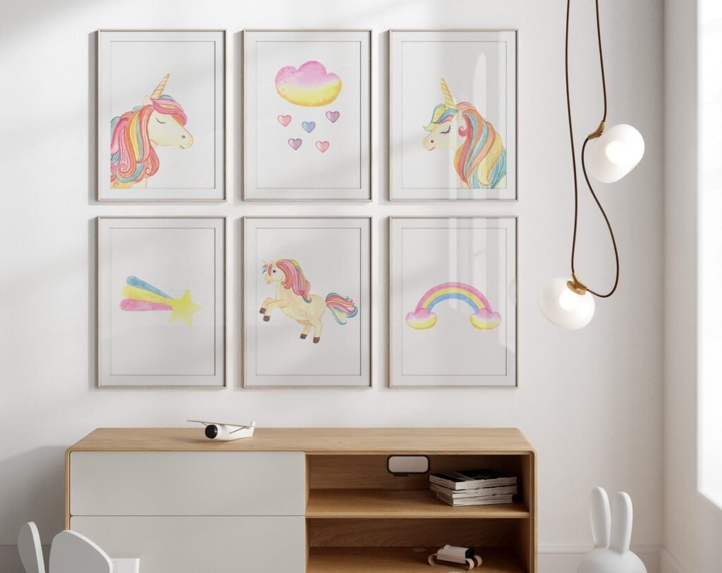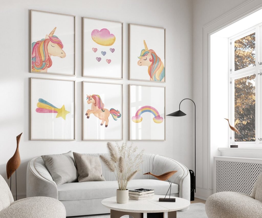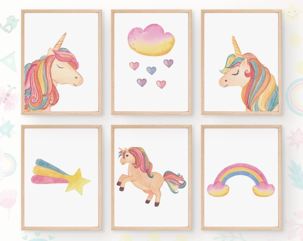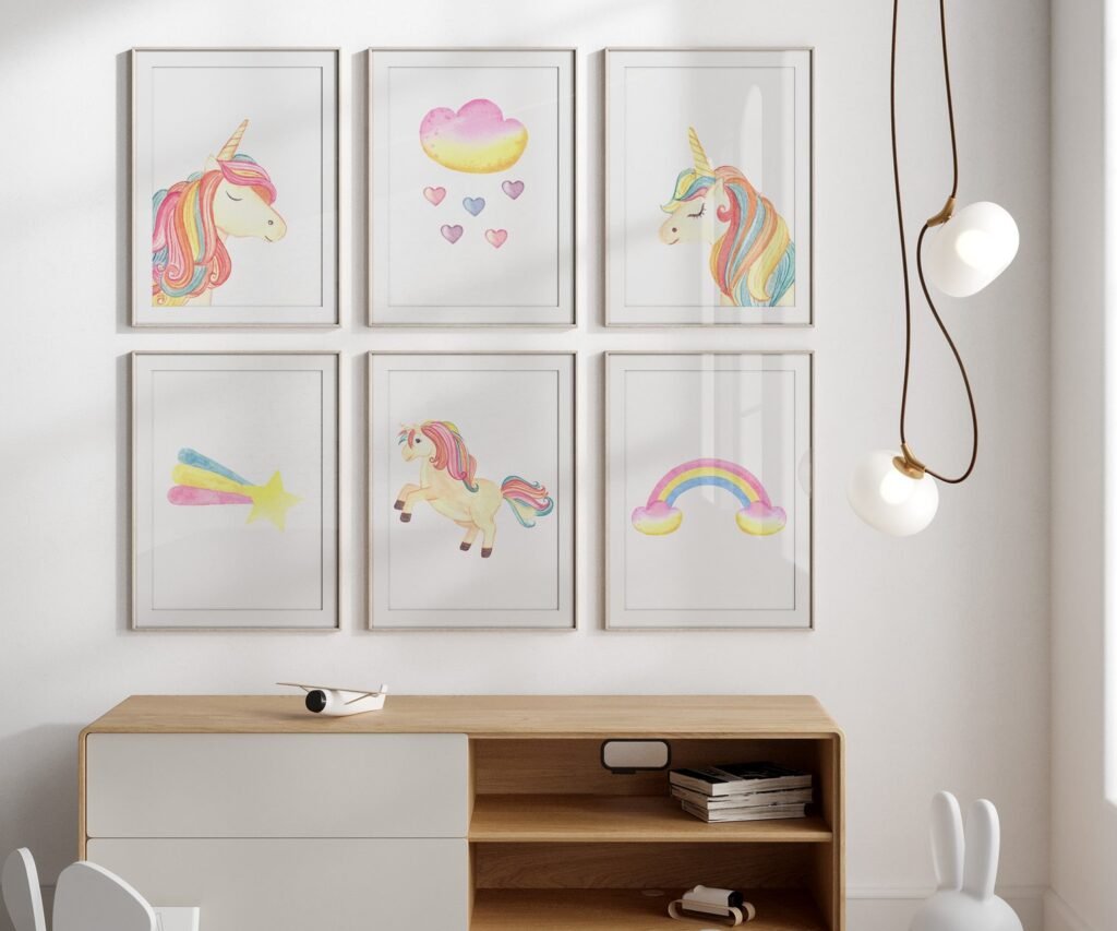 Our Set of 6 Unicorn wall art set, Printable unicorn art, Girls room decor, Unicorn gold glitter, Unicorn prints,cloud rainbow, soothing colors, and heartwarming quotes that are bound to bring joy and comfort to your baby’s room. Each print is thoughtfully crafted to add a touch of magic and wonder, making it an ideal gift for new parents or a special treat for your own bundle of joy.