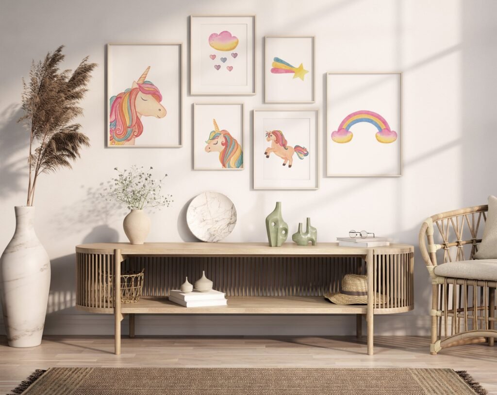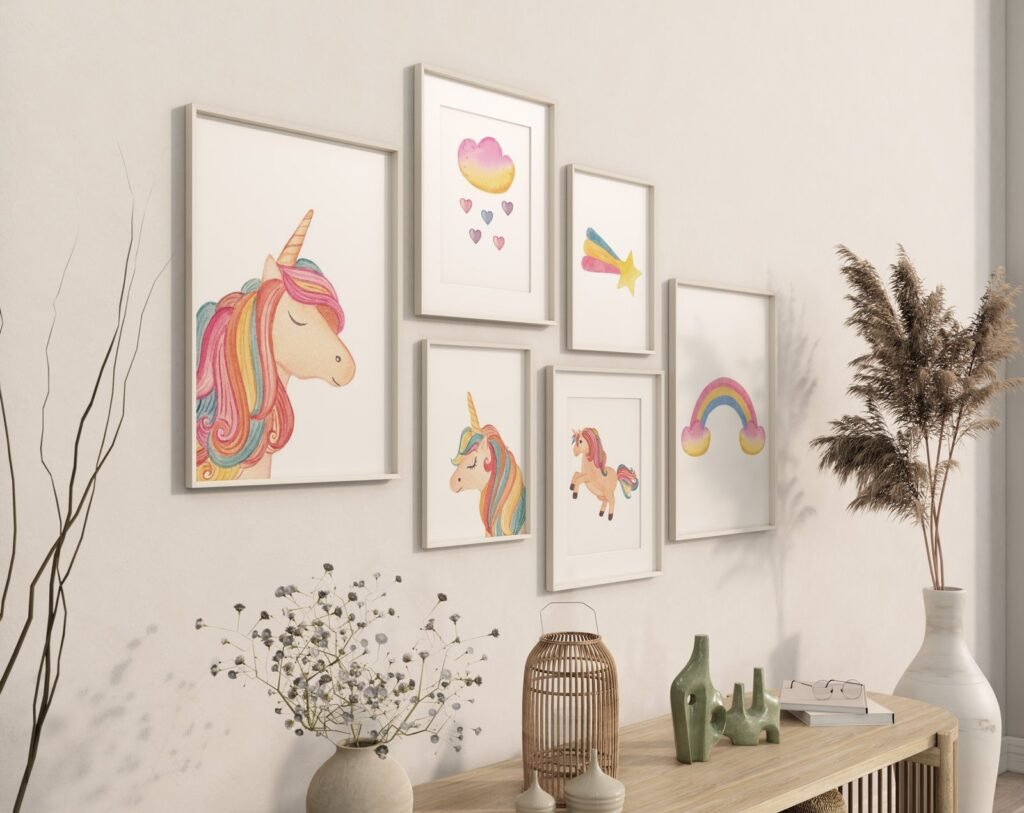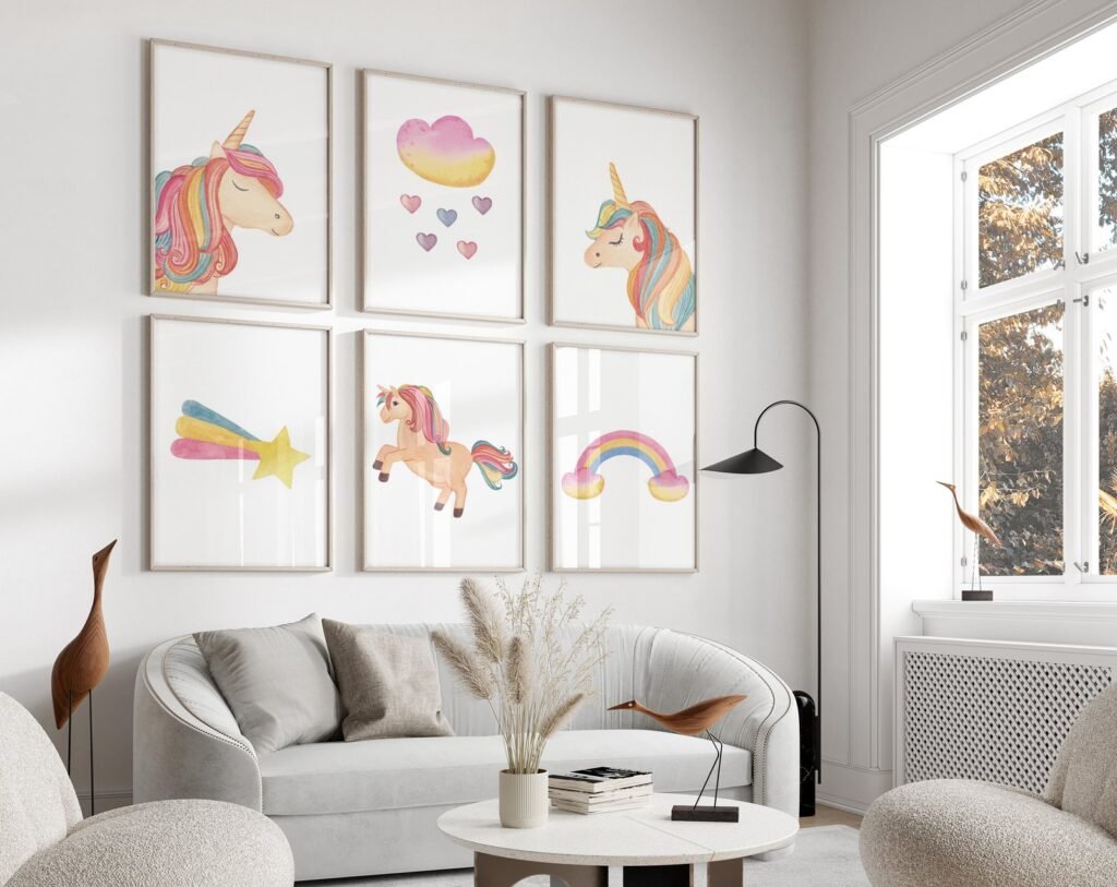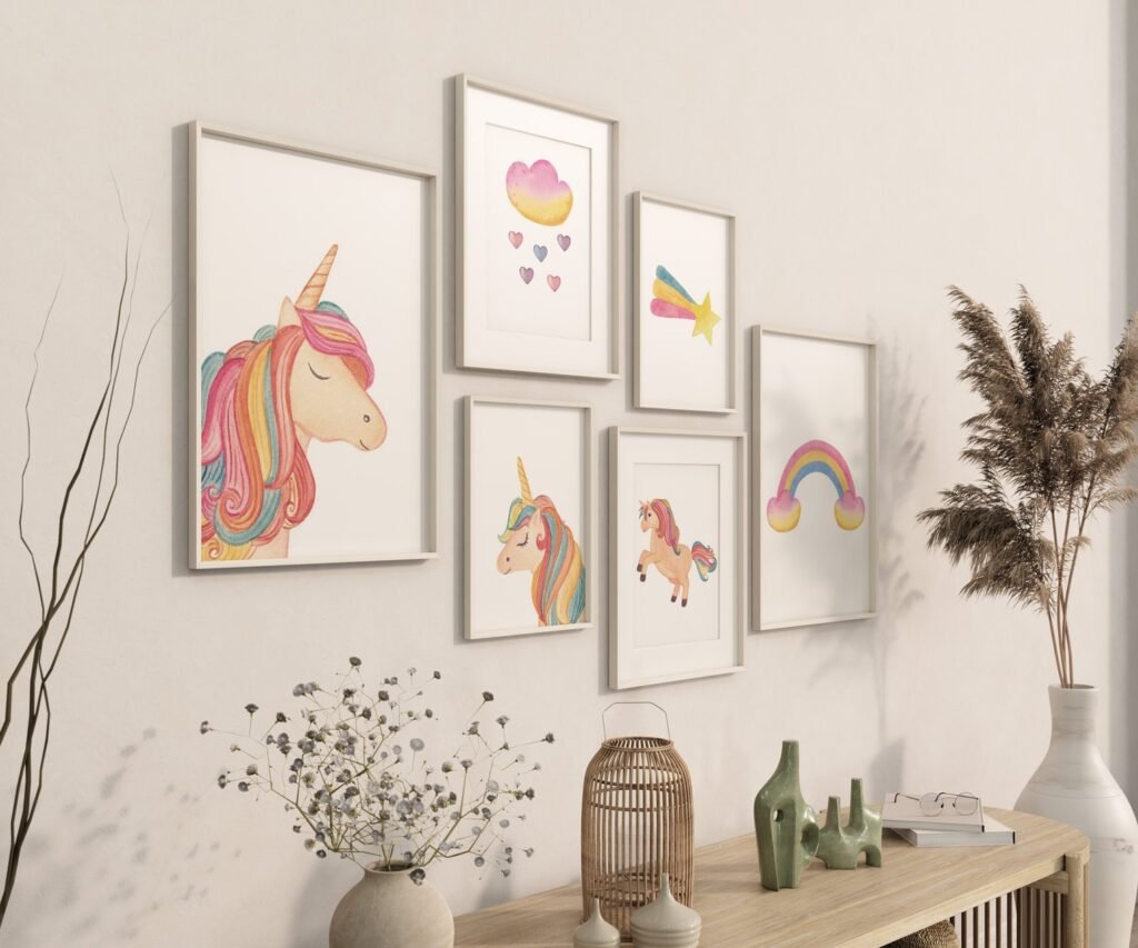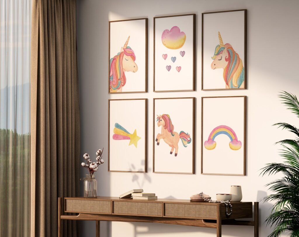 Our Set of 6 Unicorn wall art set, Printable unicorn art, Girls room decor, Unicorn gold glitter, Unicorn prints,cloud rainbow, soothing colors, and heartwarming quotes that are bound to bring joy and comfort to your baby’s room. Each print is thoughtfully crafted to add a touch of magic and wonder, making it an ideal gift for new parents or a special treat for your own bundle of joy.