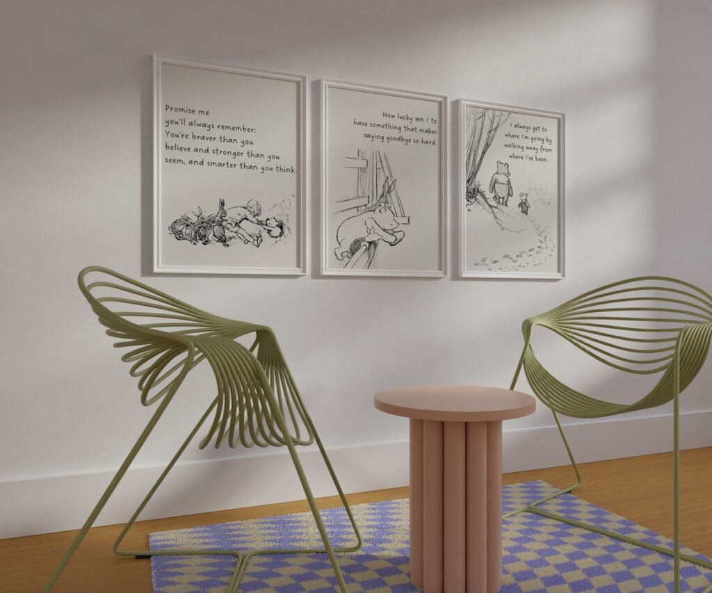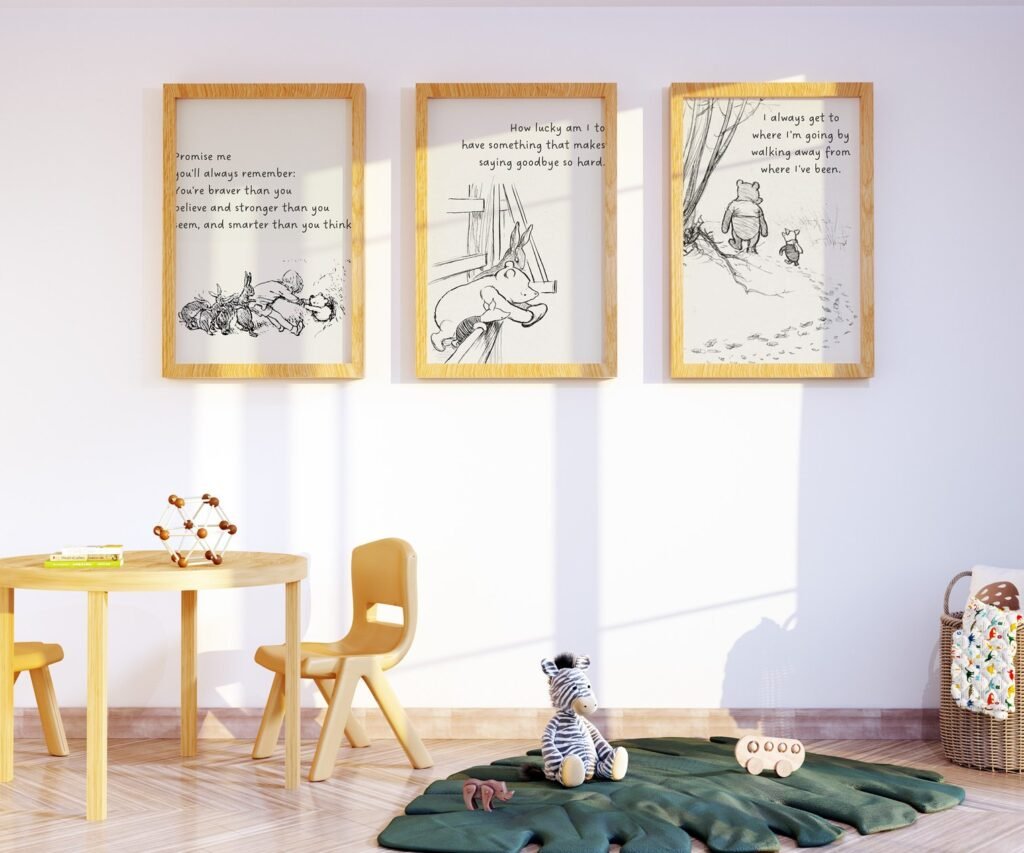Our Winnie the Pooh Quote Prints, Black and White Pooh, set of 3, soothing colors, and heartwarming quotes that are bound to bring joy and comfort to your baby’s room. Each print is thoughtfully crafted to add a touch of magic and wonder, making it an ideal gift for new parents or a special treat for your own bundle of joy.