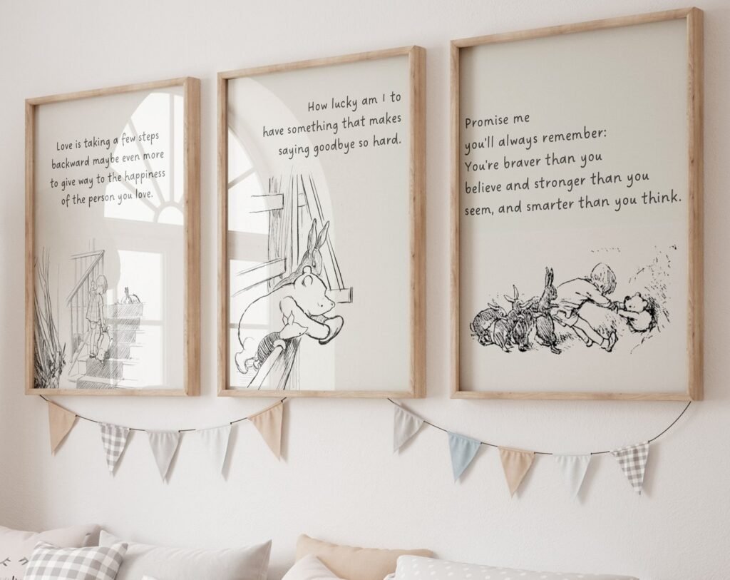 Our Winnie the Pooh Quote Prints, Black and White Pooh, set of 3, soothing colors, and heartwarming quotes that are bound to bring joy and comfort to your baby’s room. Each print is thoughtfully crafted to add a touch of magic and wonder, making it an ideal gift for new parents or a special treat for your own bundle of joy.