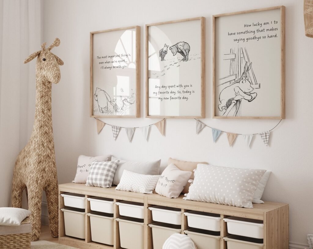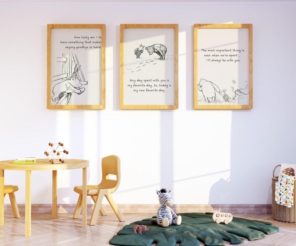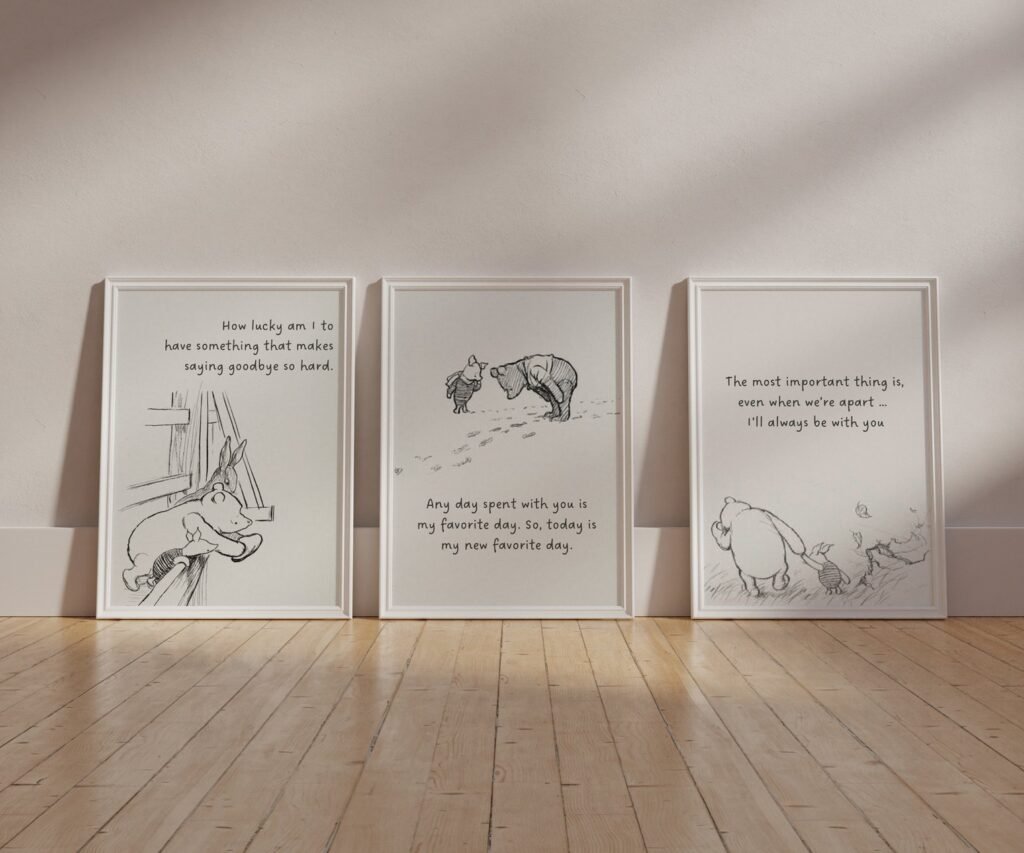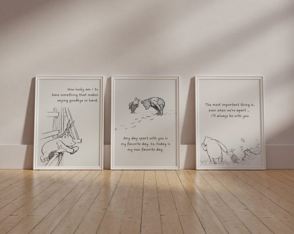 Our Winnie the Pooh Quote Prints, Black and White Pooh, set of 3, soothing colors, and heartwarming quotes that are bound to bring joy and comfort to your baby’s room. Each print is thoughtfully crafted to add a touch of magic and wonder, making it an ideal gift for new parents or a special treat for your own bundle of joy.