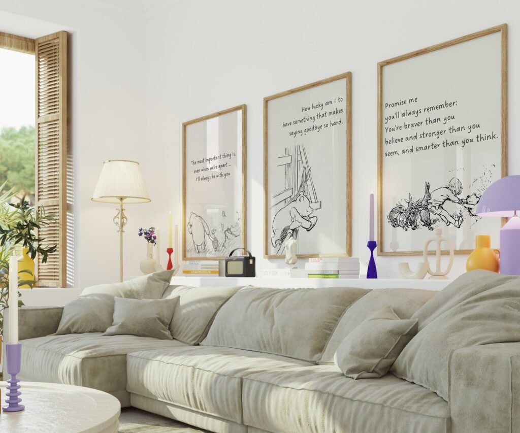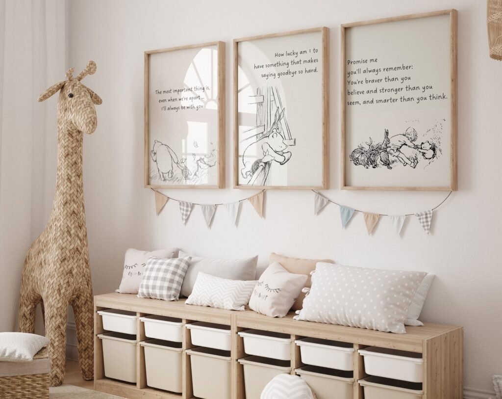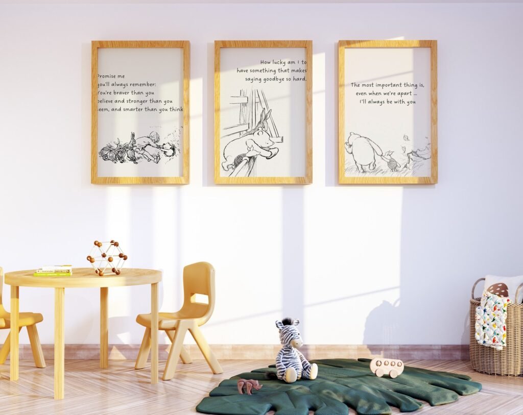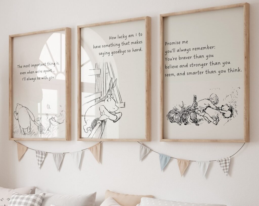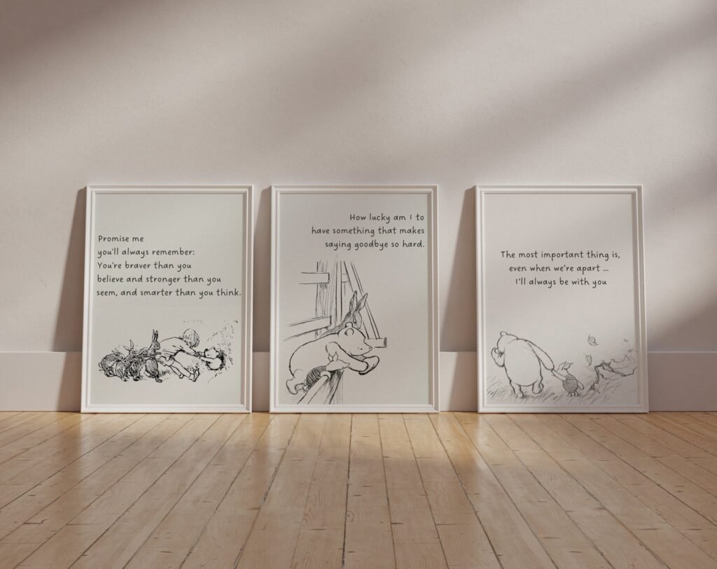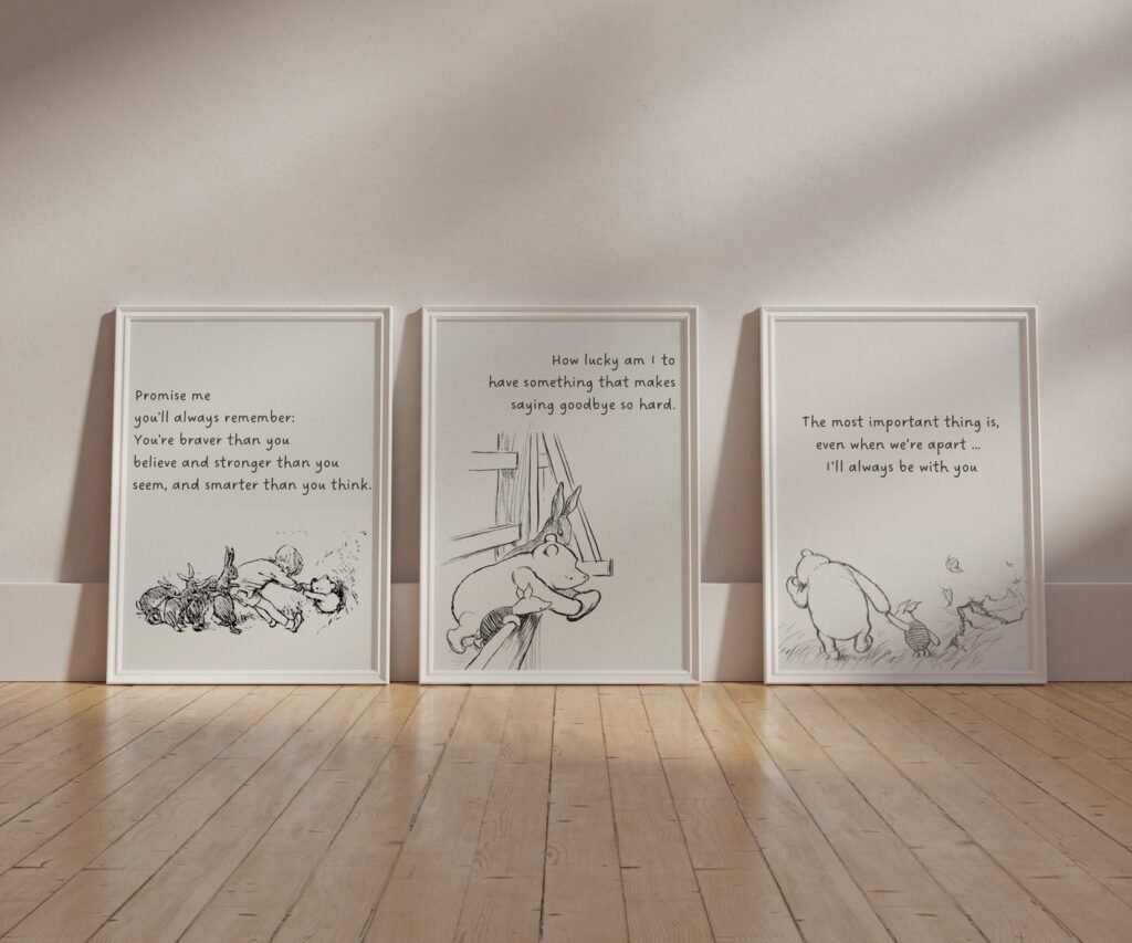 Our Winnie the Pooh Quote Prints, Black and White Pooh, set of 3, soothing colors, and heartwarming quotes that are bound to bring joy and comfort to your baby’s room. Each print is thoughtfully crafted to add a touch of magic and wonder, making it an ideal gift for new parents or a special treat for your own bundle of joy.