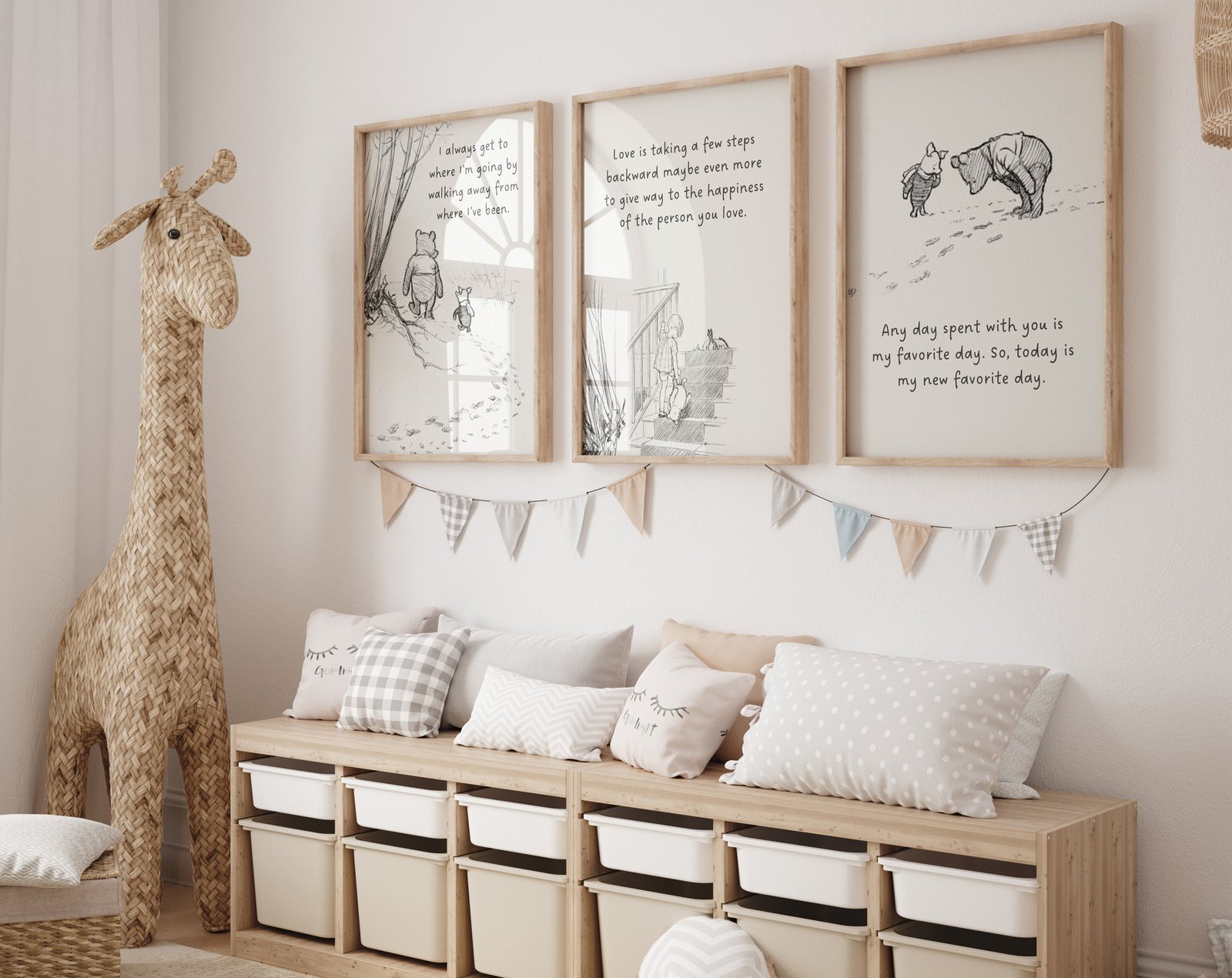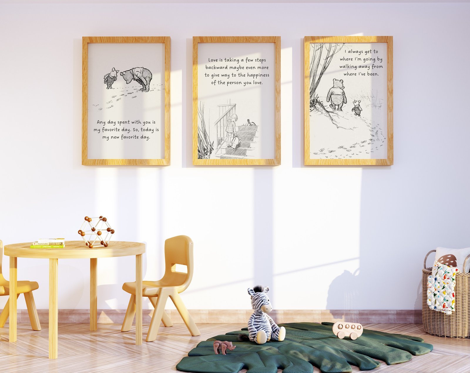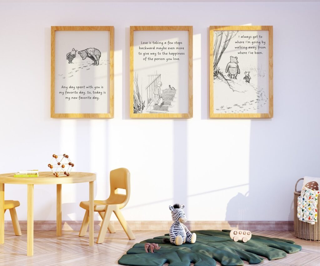 Our Winnie the Pooh Quote Prints, Black and White Pooh, set of 3, soothing colors, and heartwarming quotes that are bound to bring joy and comfort to your baby’s room. Each print is thoughtfully crafted to add a touch of magic and wonder, making it an ideal gift for new parents or a special treat for your own bundle of joy.