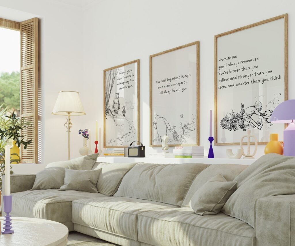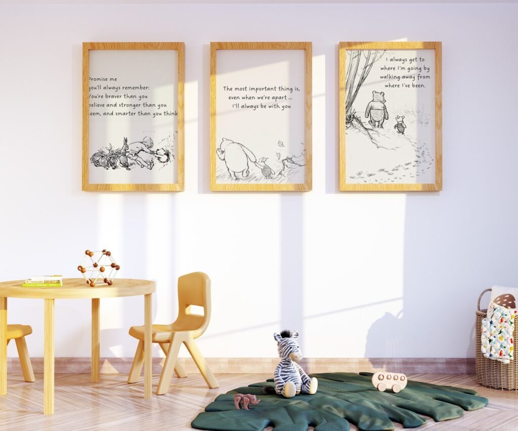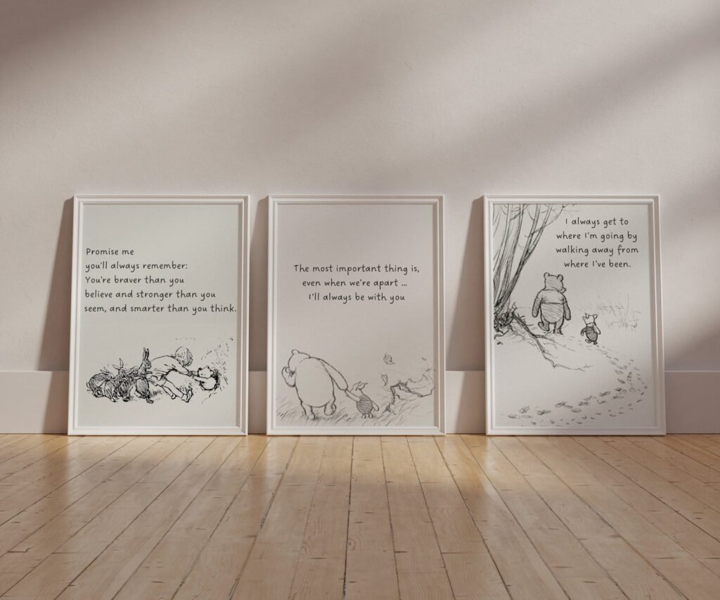 Our Winnie the Pooh Quote Prints, Black and White Pooh, set of 3, soothing colors, and heartwarming quotes that are bound to bring joy and comfort to your baby’s room. Each print is thoughtfully crafted to add a touch of magic and wonder, making it an ideal gift for new parents or a special treat for your own bundle of joy.