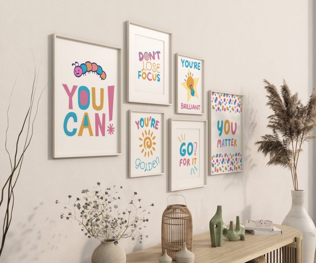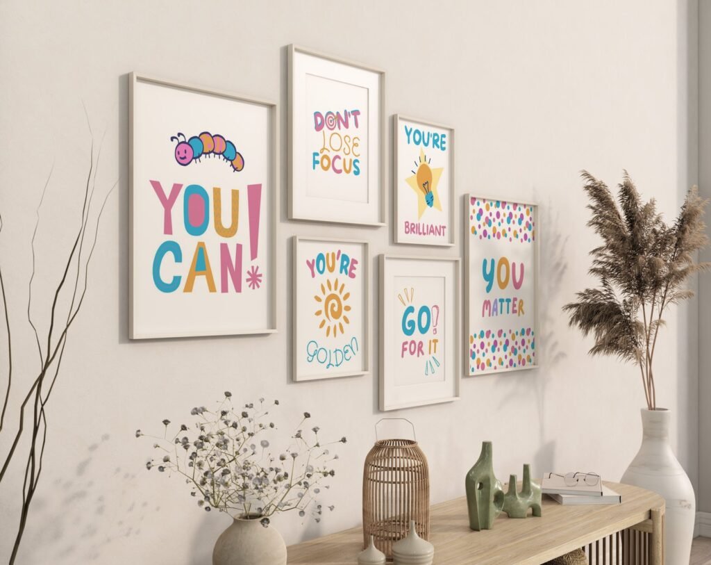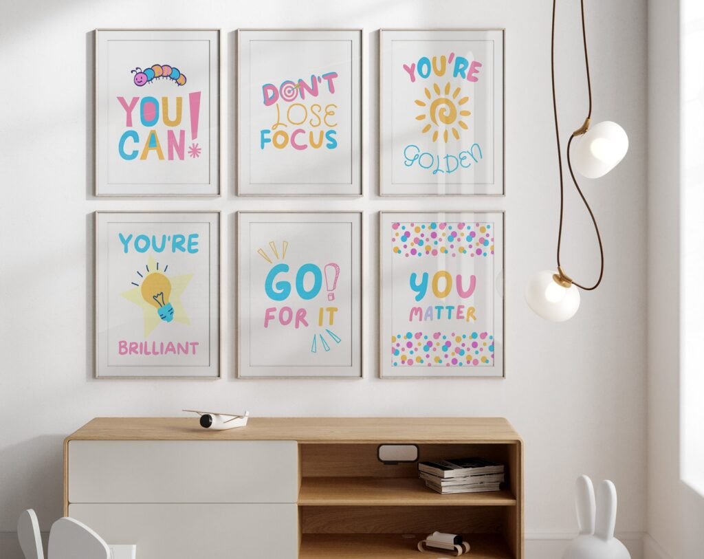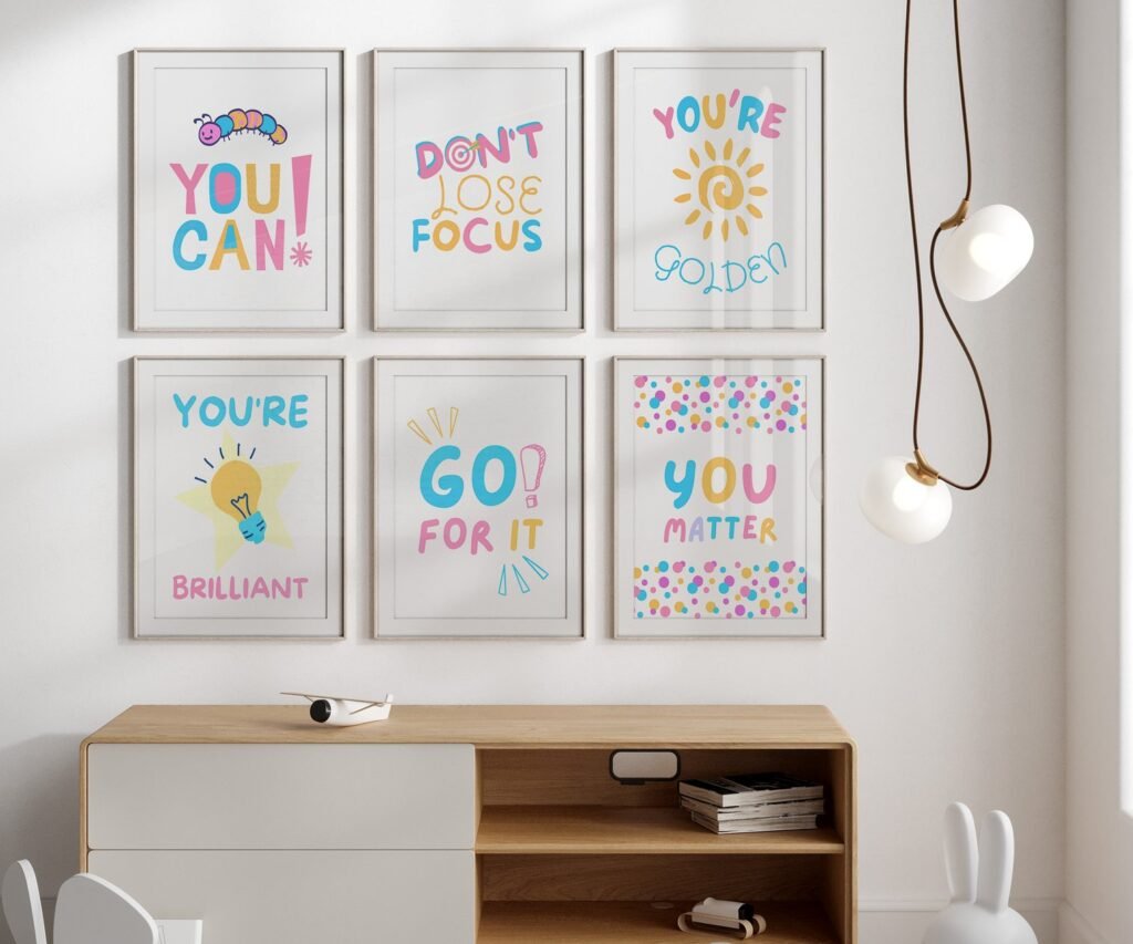 Our You Can, kids Positive Affirmations, set of 6, soothing colors, and heartwarming quotes that are bound to bring joy and comfort to your baby’s room. Each print is thoughtfully crafted to add a touch of magic and wonder, making it an ideal gift for new parents or a special treat for your own bundle of joy.
