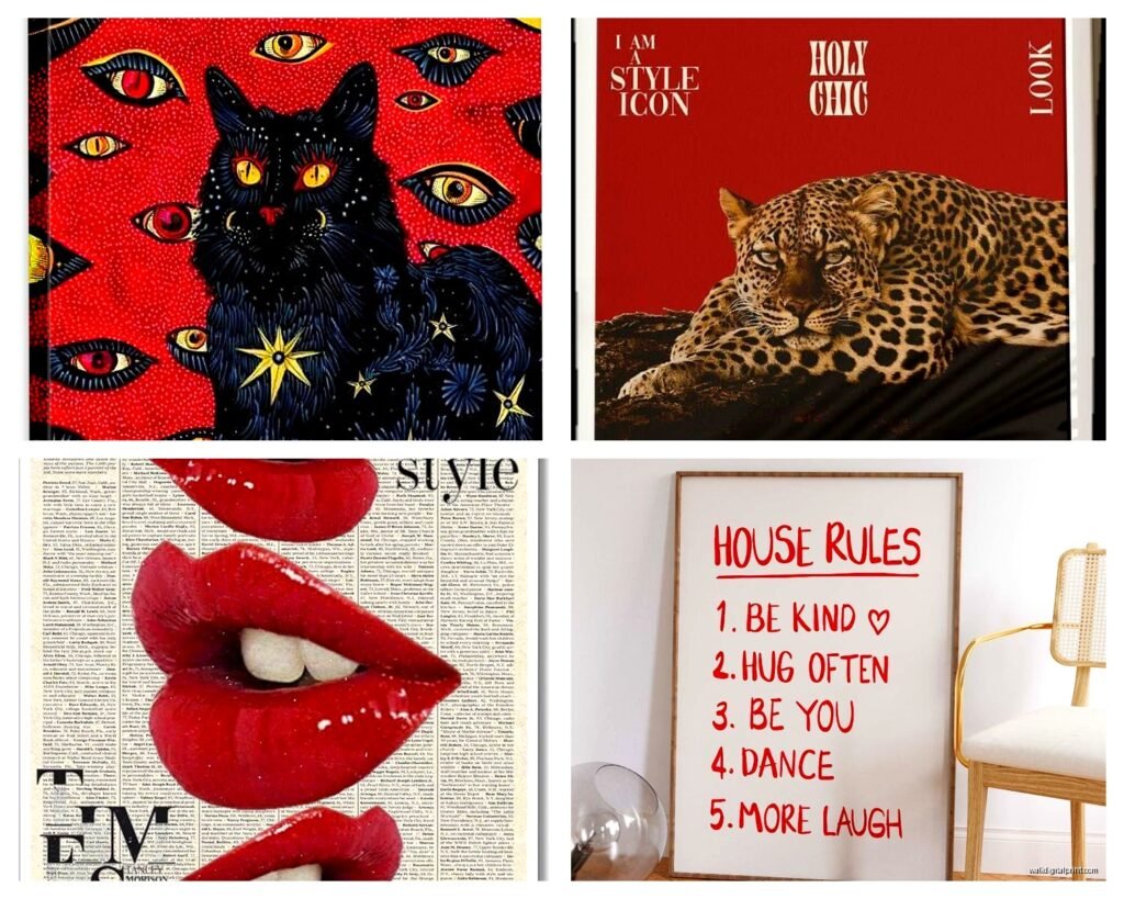 Black frames make red art pop like crazy – high contrast, super modern, works almost every time. White or cream frames soften the intensity which can be good if your red is already super saturated. Gold frames with burgundy art is that classic luxe look but it can tip into dated territory if you’re not careful.