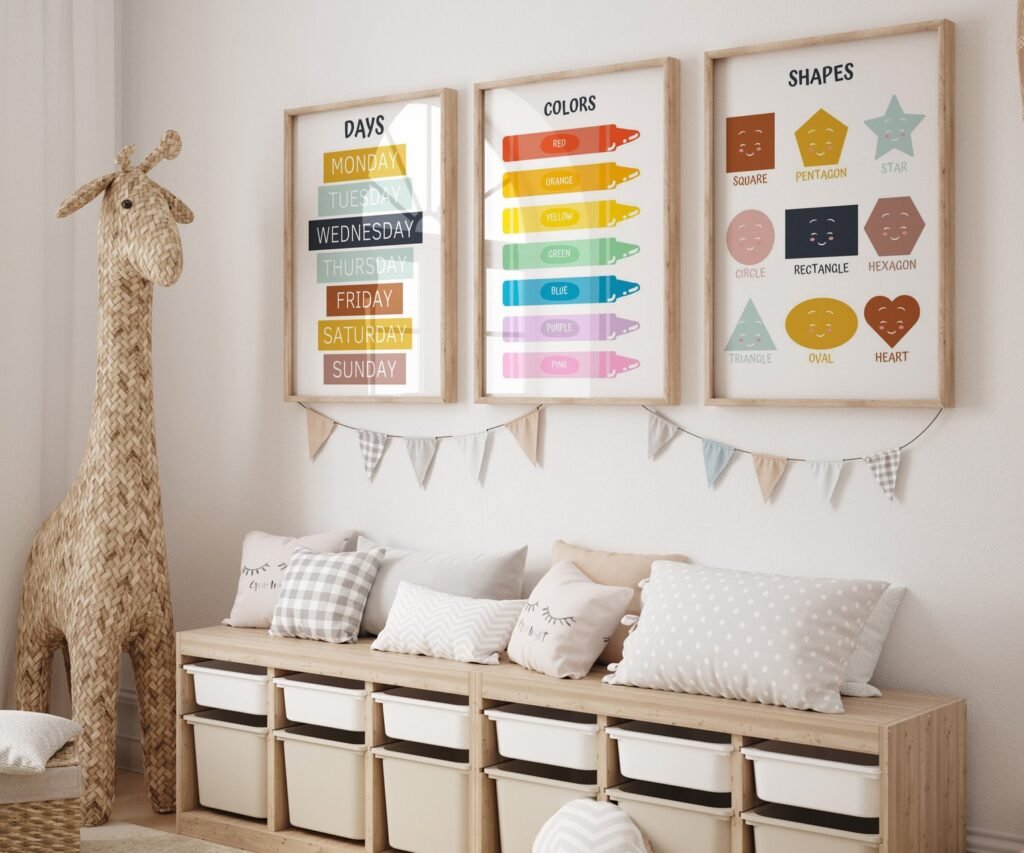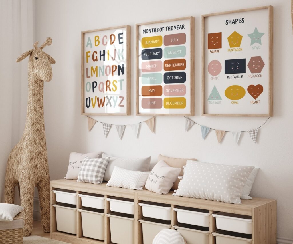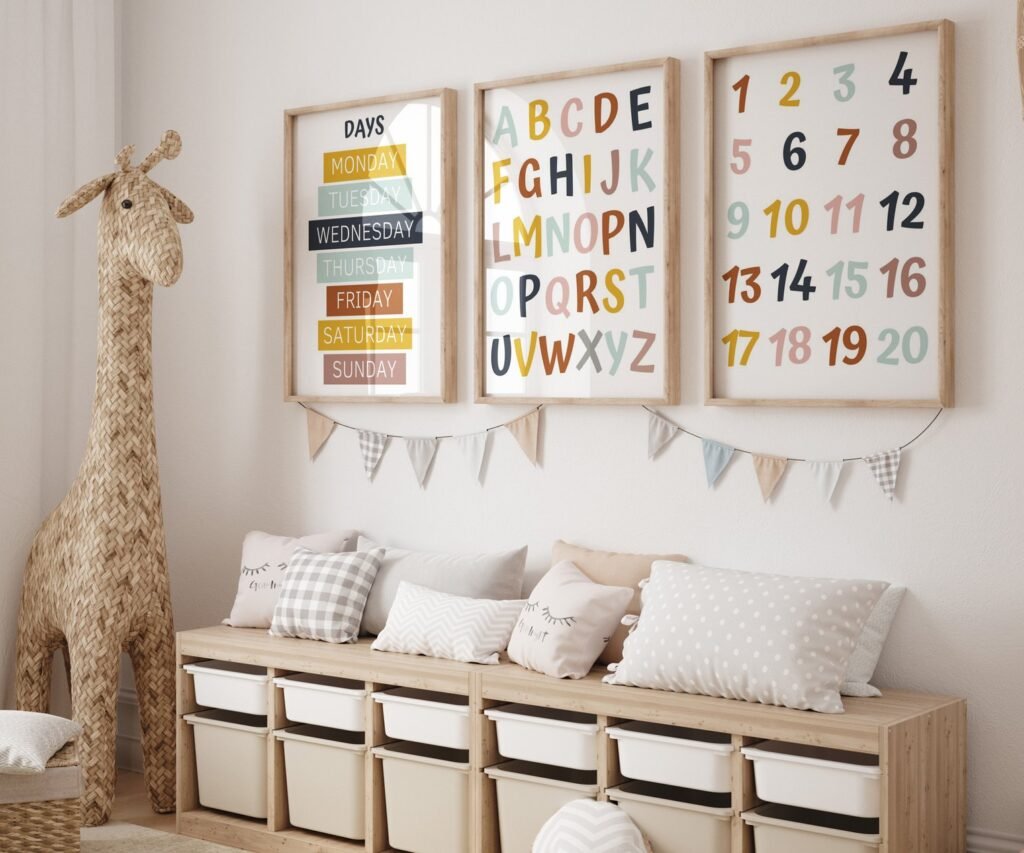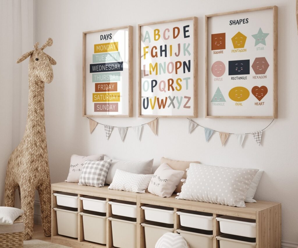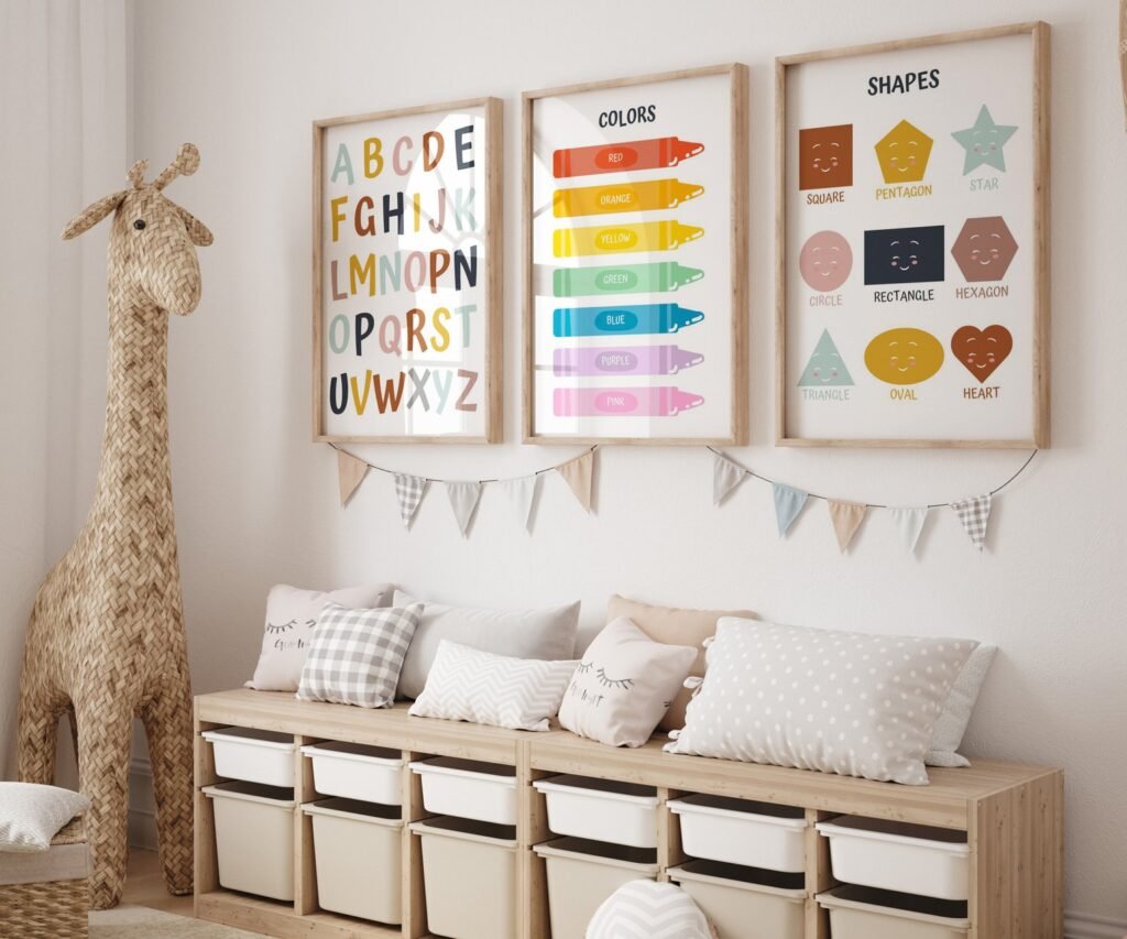 Kids Wall Art, Children’s Wall Art, Nursery set of 3 Prints, Educational Wall Art, Alphabet, Numbers, Colours, Shapes , Classroom print