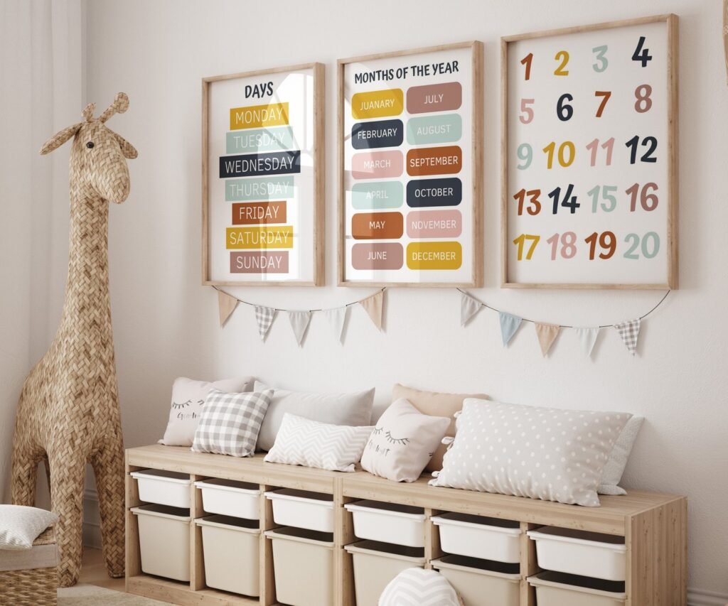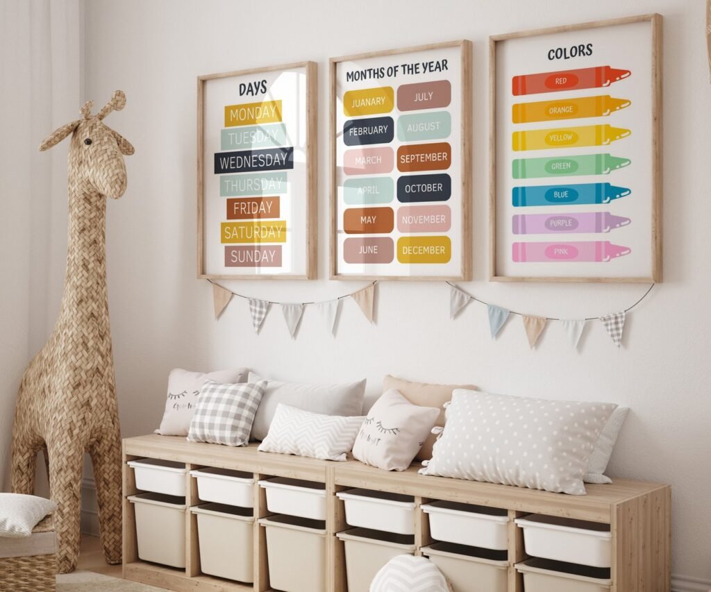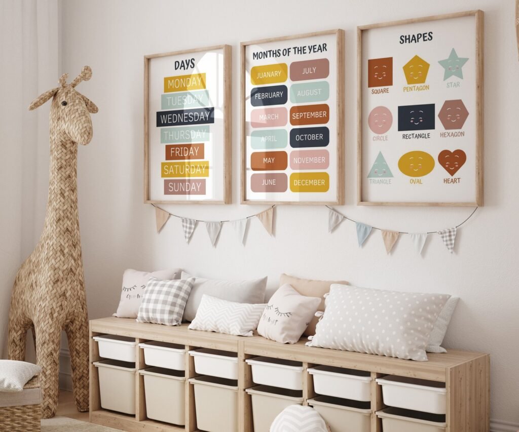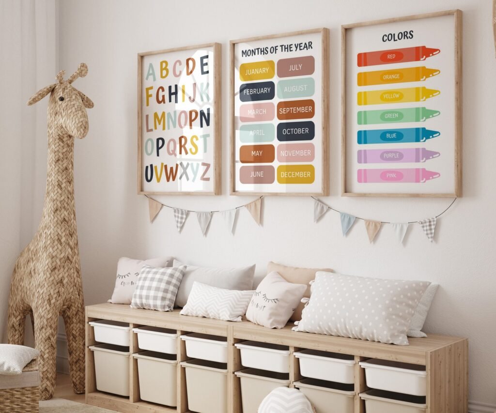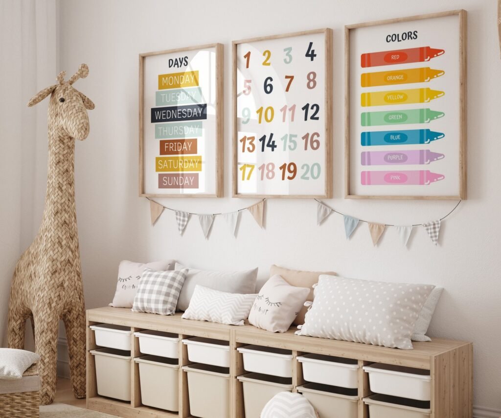 Kids Wall Art, Children’s Wall Art, Nursery set of 3 Prints, Educational Wall Art, Alphabet, Numbers, Colours, Shapes , Classroom print