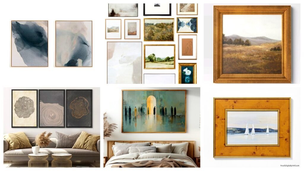 Living room needs bigger pieces or curated gallery walls. Bedroom can handle more personal or abstract stuff. Kitchen and dining areas look good with either food-related prints that aren’t too literal or botanical things or just abstracts in your color scheme.