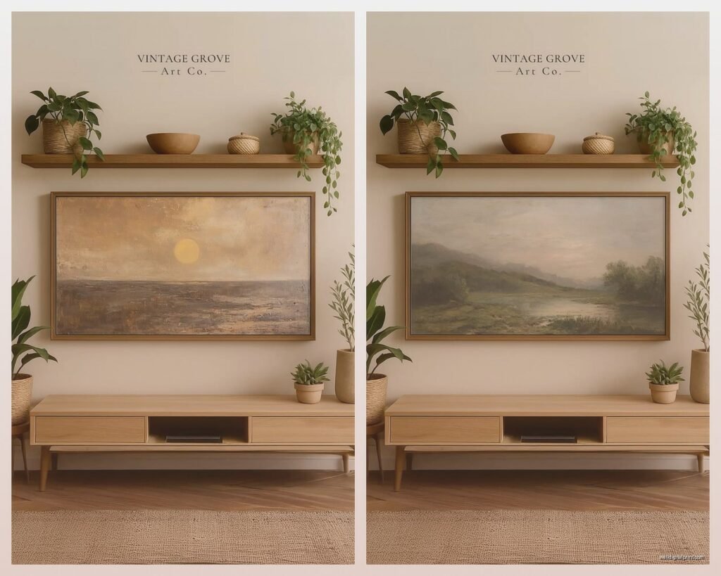 The symmetrical flanking thing where you put matching art on either side of the TV. This is the safest option and honestly looks good in like 90% of situations. I did this in a client’s mid-century modern space with two large botanical prints in matching black frames and it was *chef’s kiss*. Super clean, doesn’t fight with the TV for attention.