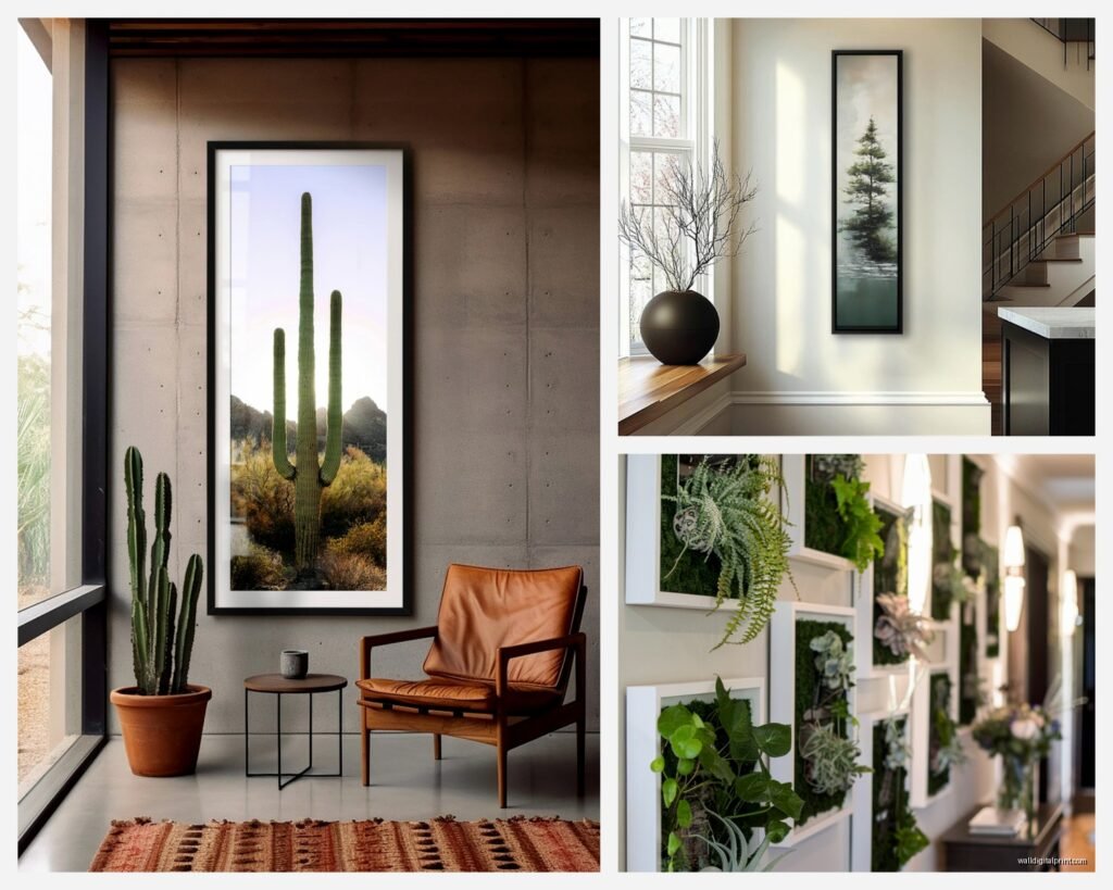 The thing about tall pieces is they work in spaces where you literally can’t fit wide art. Like that narrow wall between two doorways? Or next to a window that’s being annoying? Vertical is gonna be your friend there.