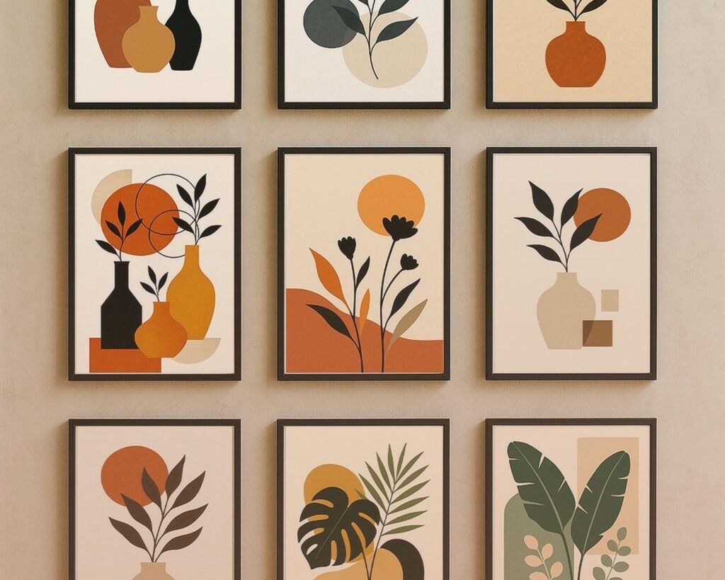 Mixed media gallery sets where you get different styles that coordinate through color – like one abstract, one photograph, one illustration. These are harder to pull off but look really curated when done right.